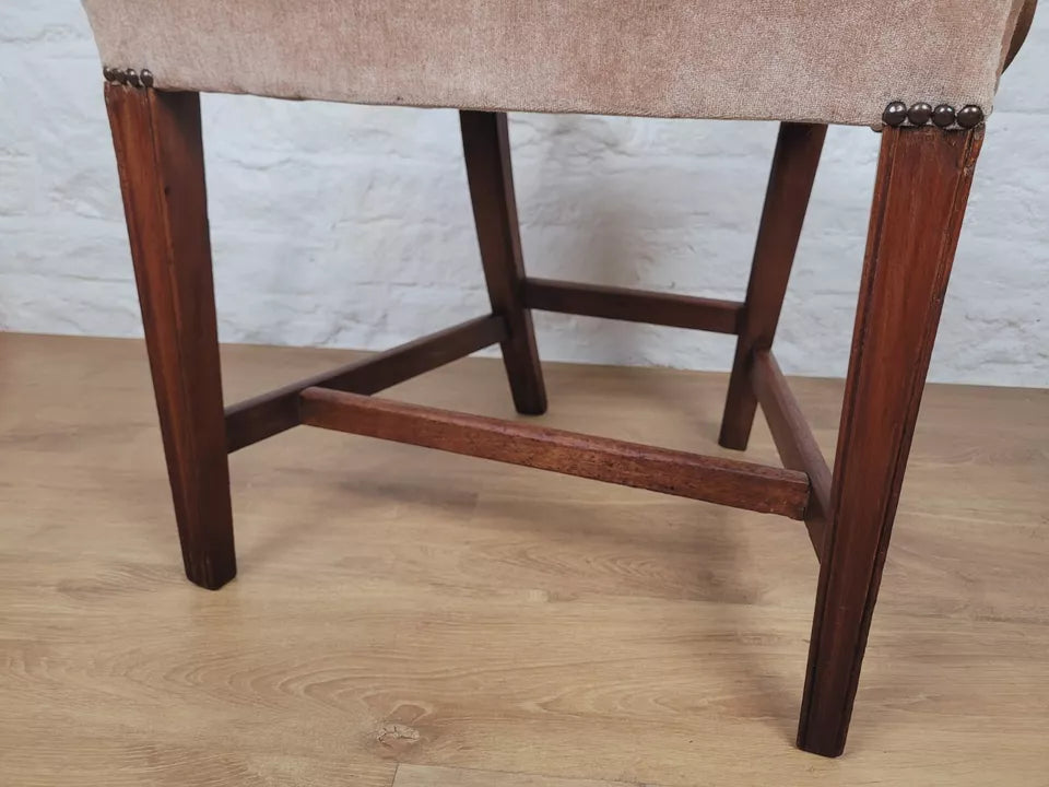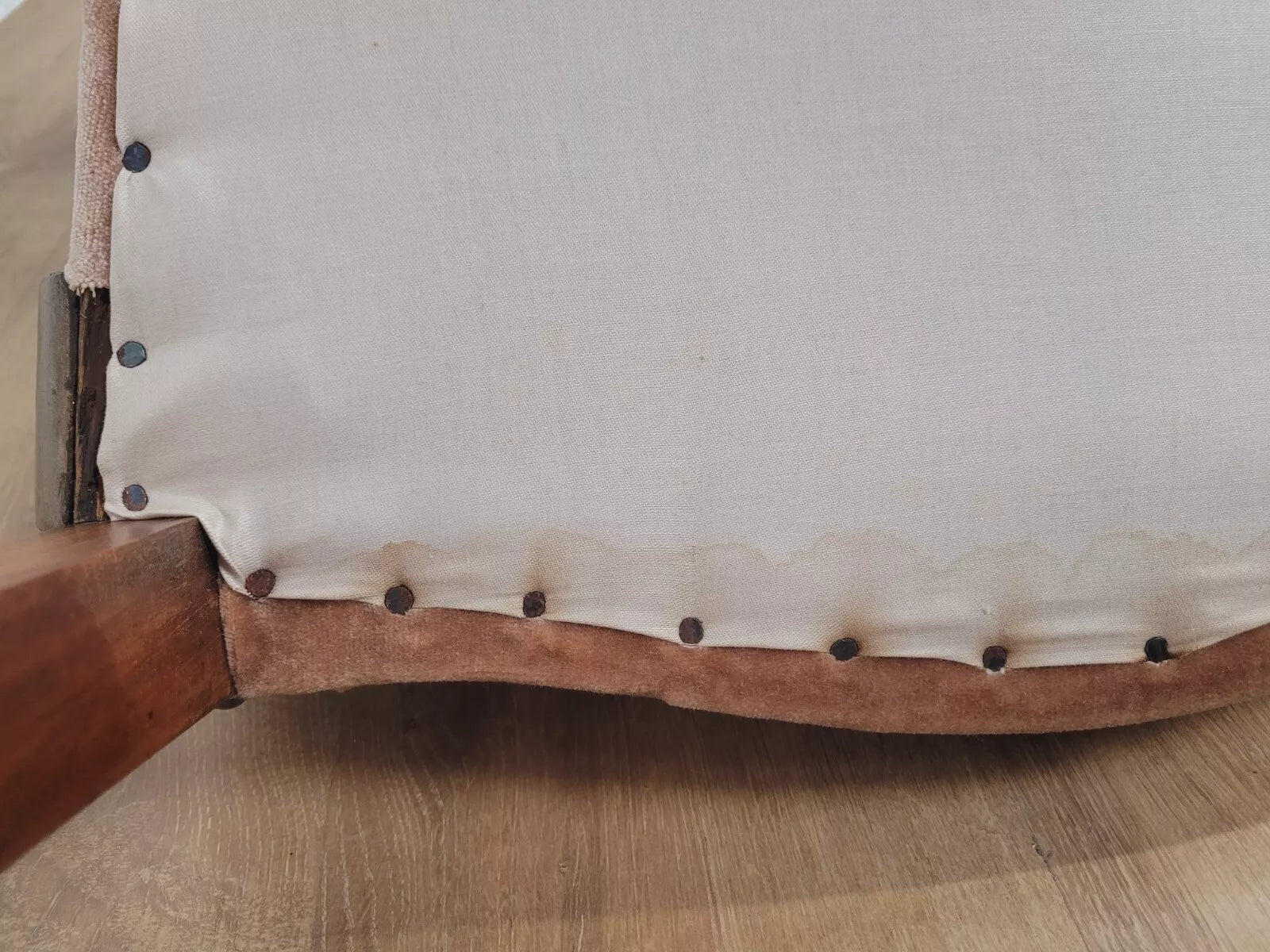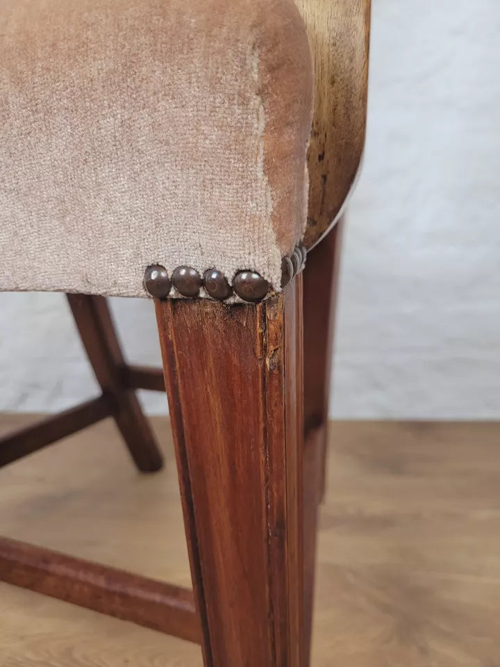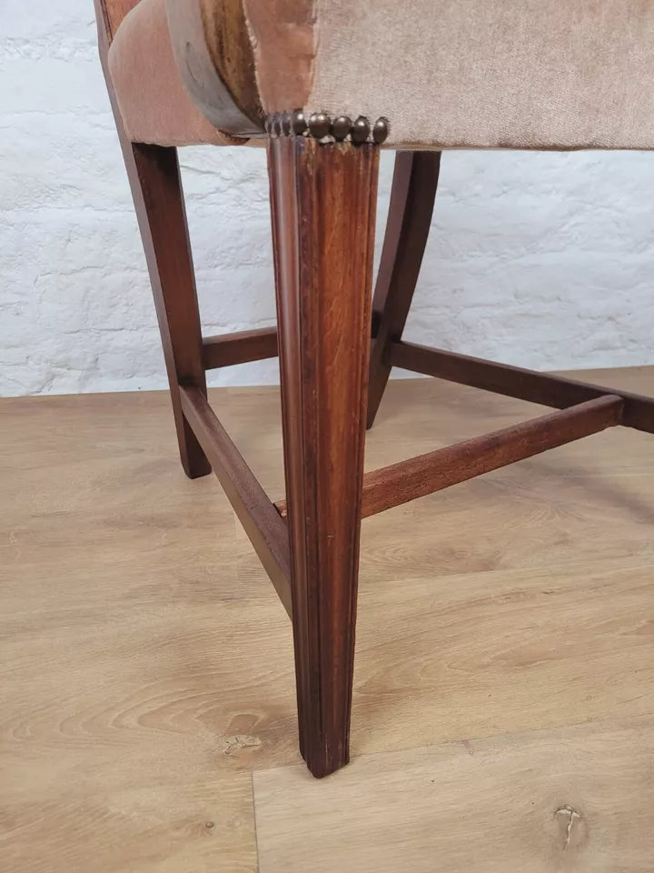 Overall, this victorian armchairs is in great antique condition, with slight signs of use and veneer wear, and a bit of chip wood to the tapered leg, as to be expected from years of age.