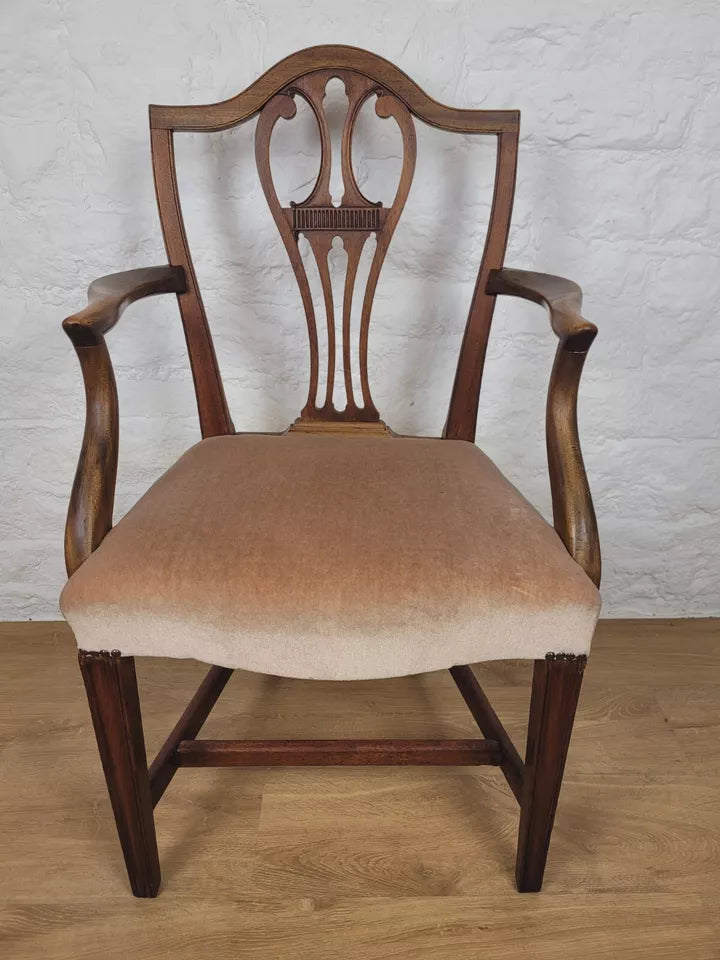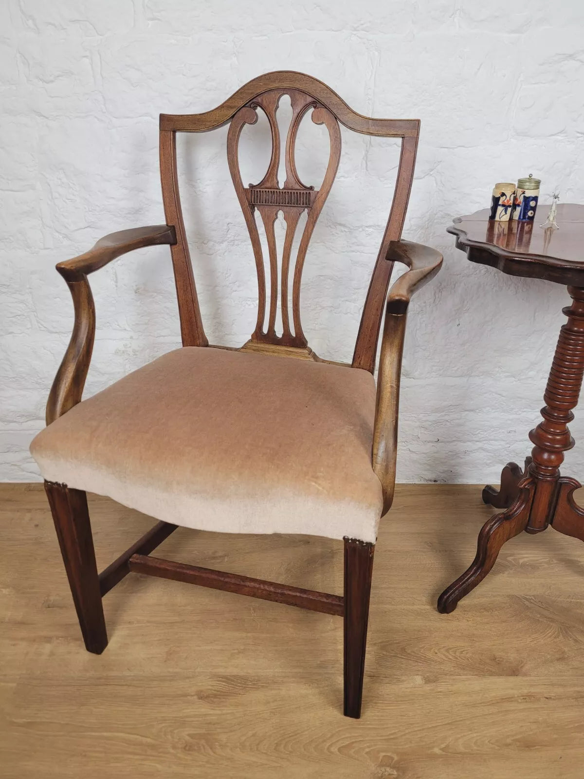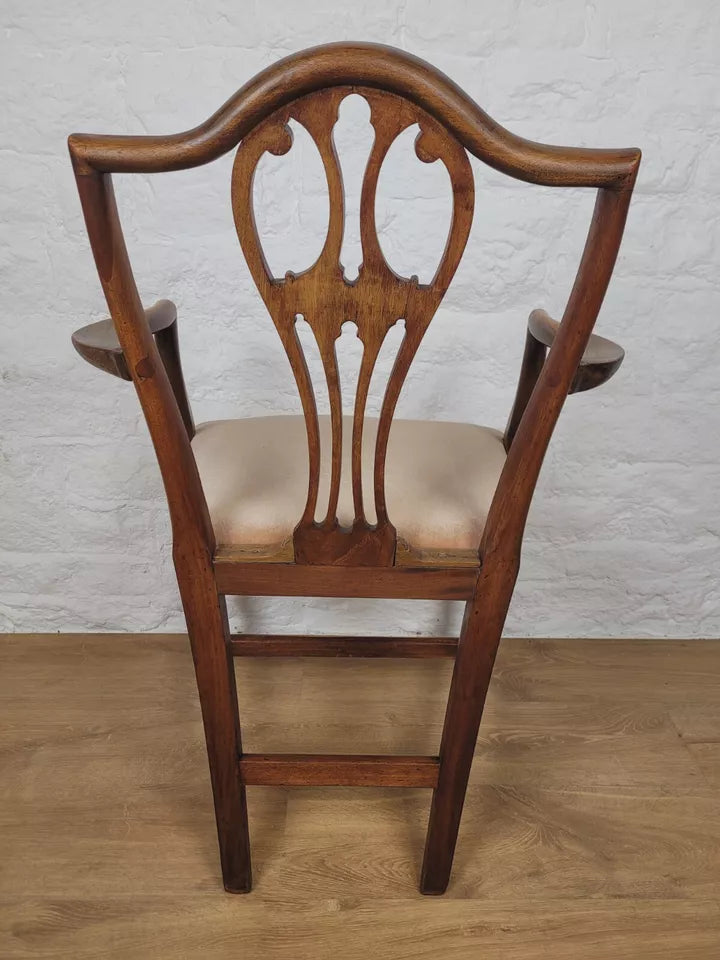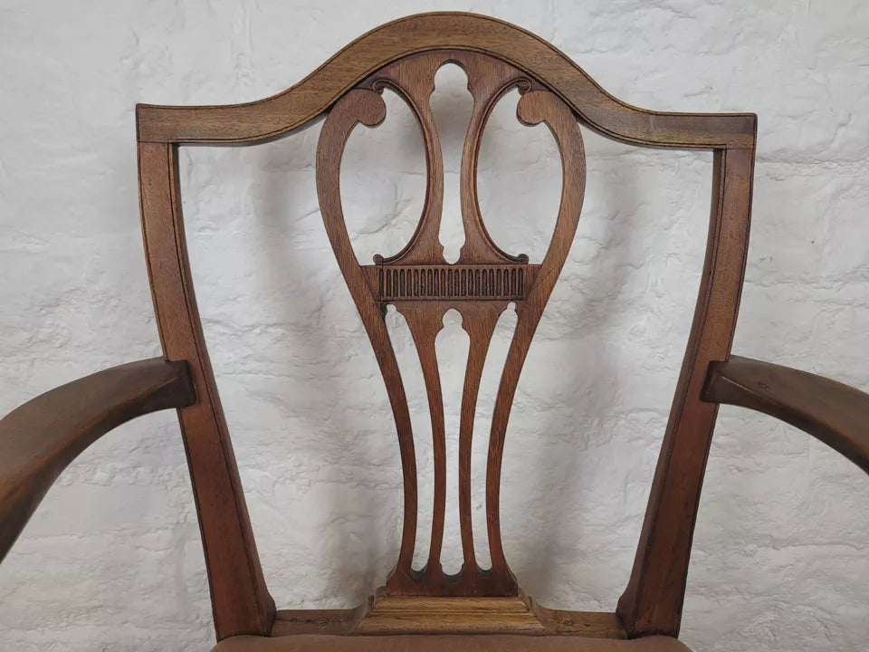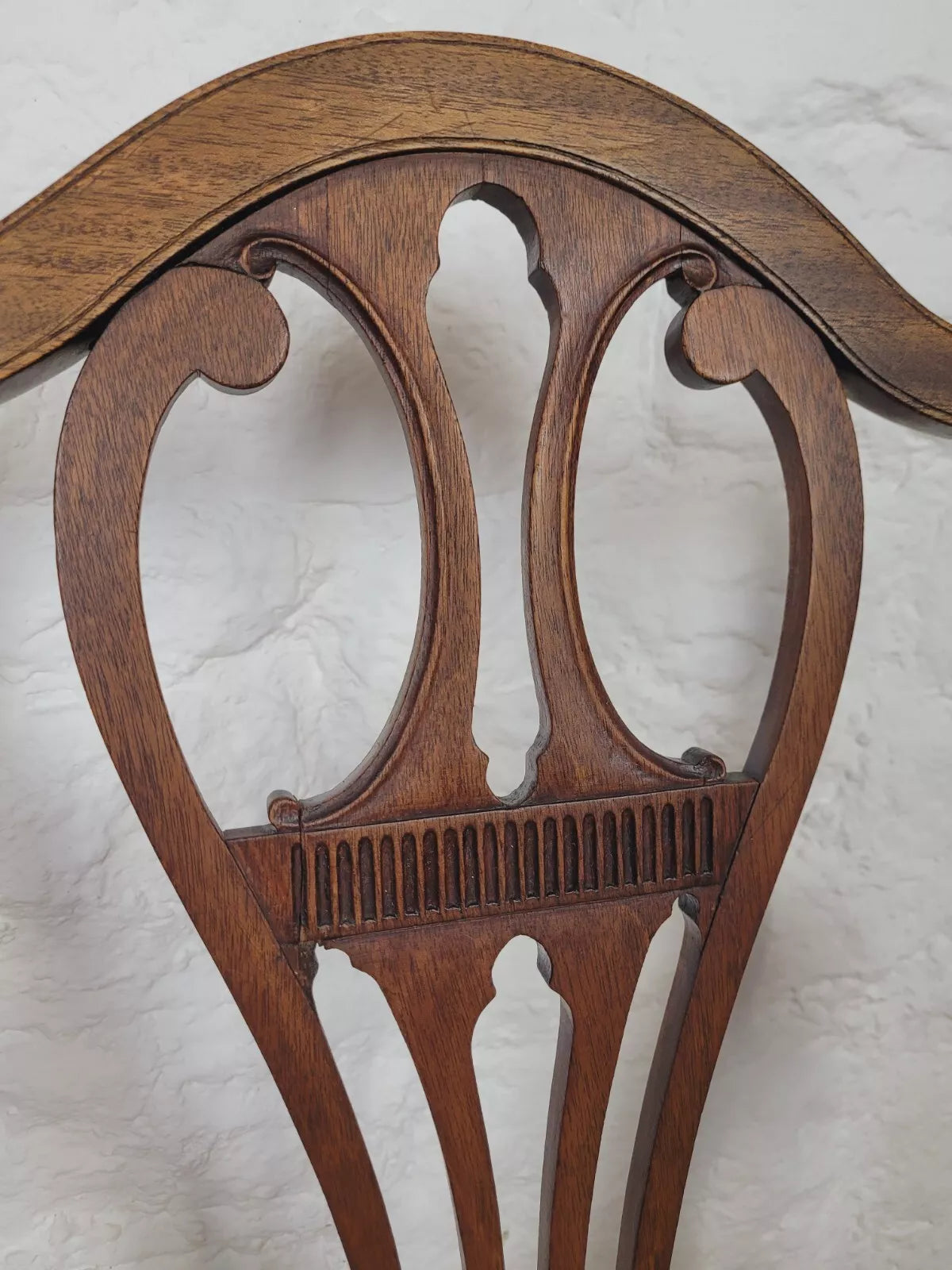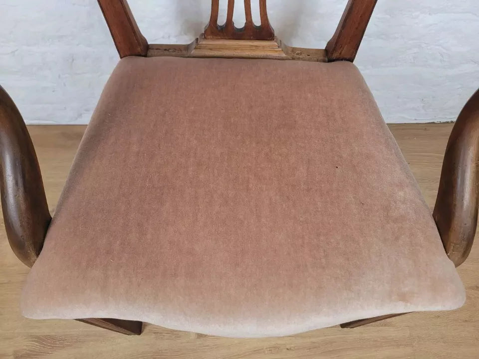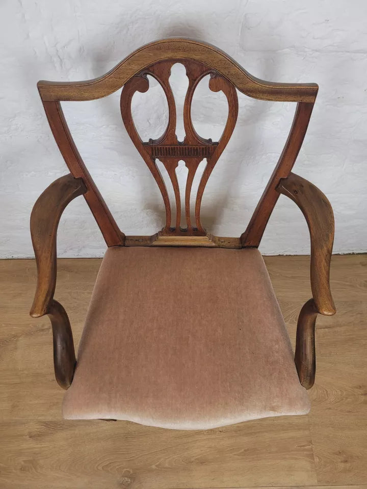 Displaying an elegantly hand carved pierced back splat, that is joined to the curved backrest rail and sweeping down side rails.