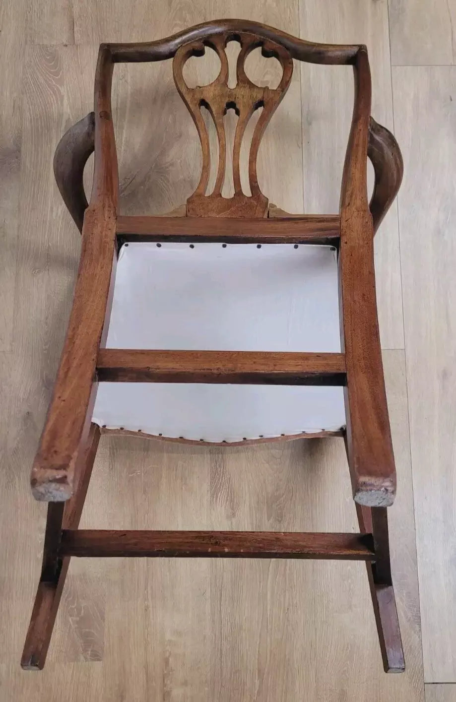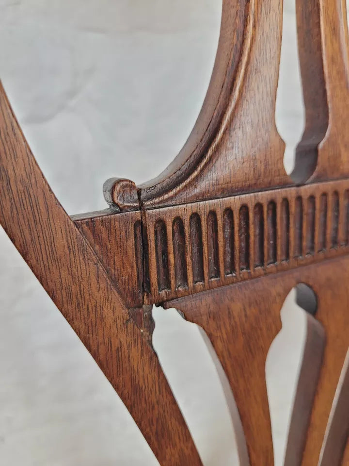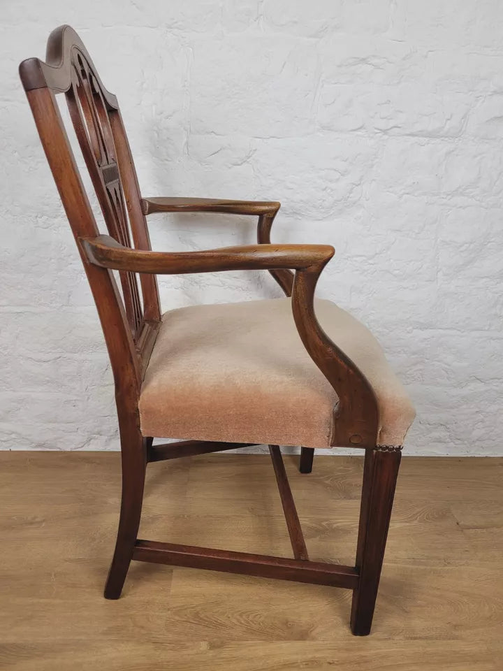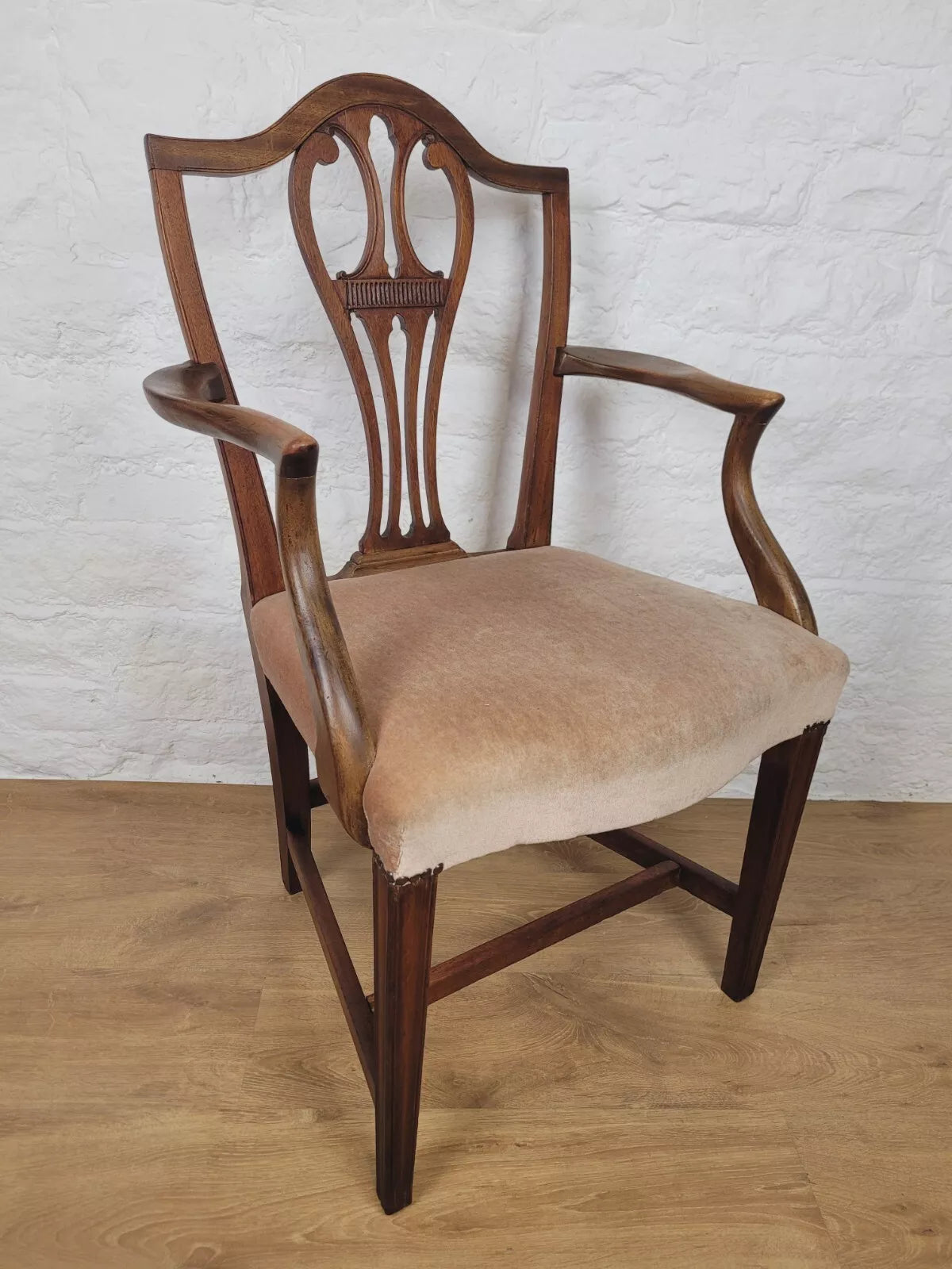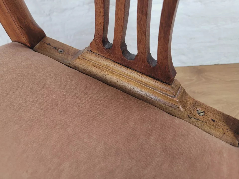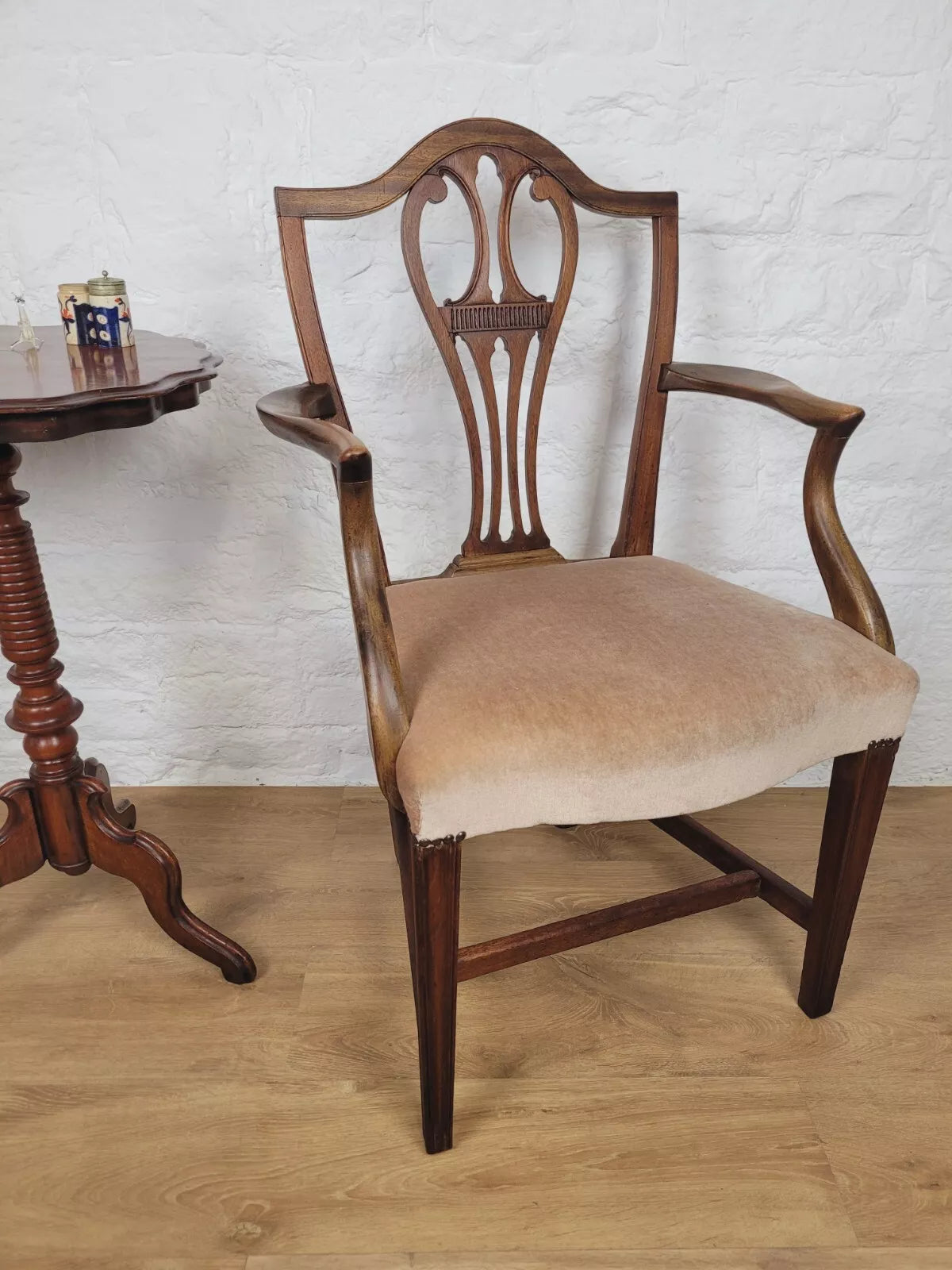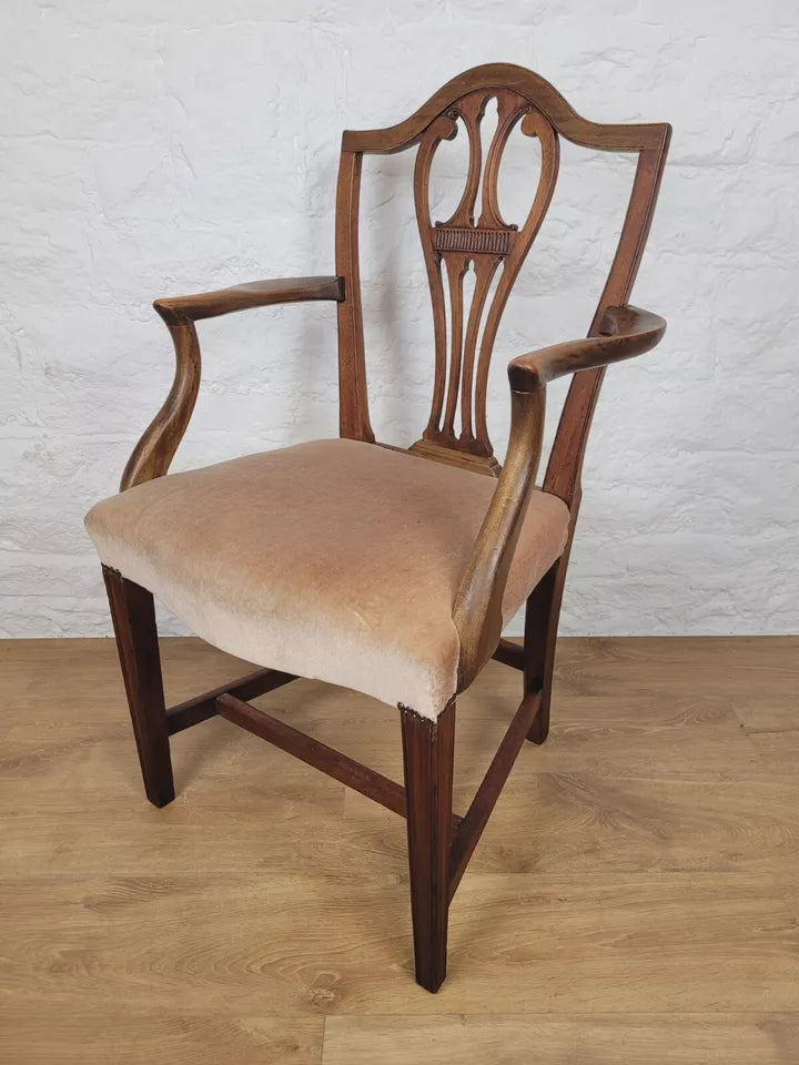 Displaying an elegantly hand carved pierced back splat, that is joined to the curved backrest rail and sweeping down side rails.