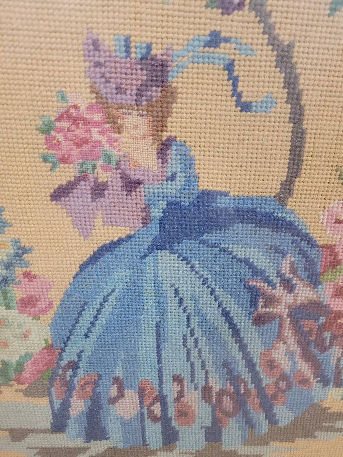 Depicting a beautiful embroidery lady in a blue dress, surrounded by flowers inside the frame.