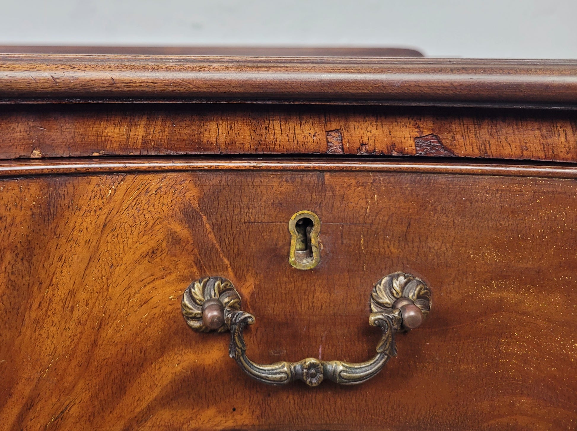 There are 5 serpentine shaped front drawer, all are finished with antique brass handles and raised boarders.