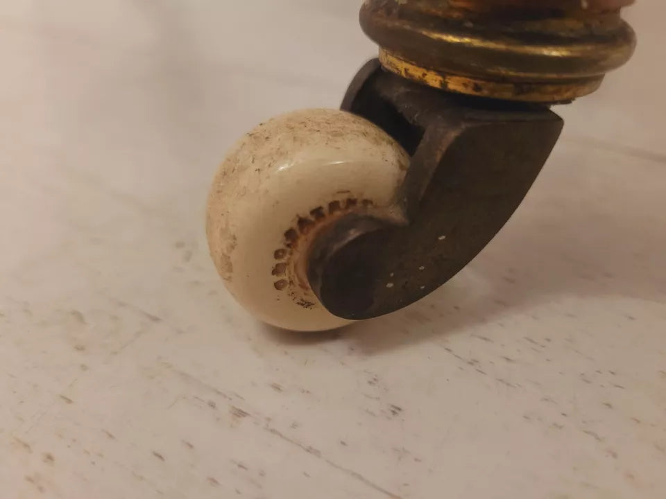 This charming chair stands proudly on two front bulbus carved fluted legs, finished with brass caps and ceramic castors, and original castors for easy movement.