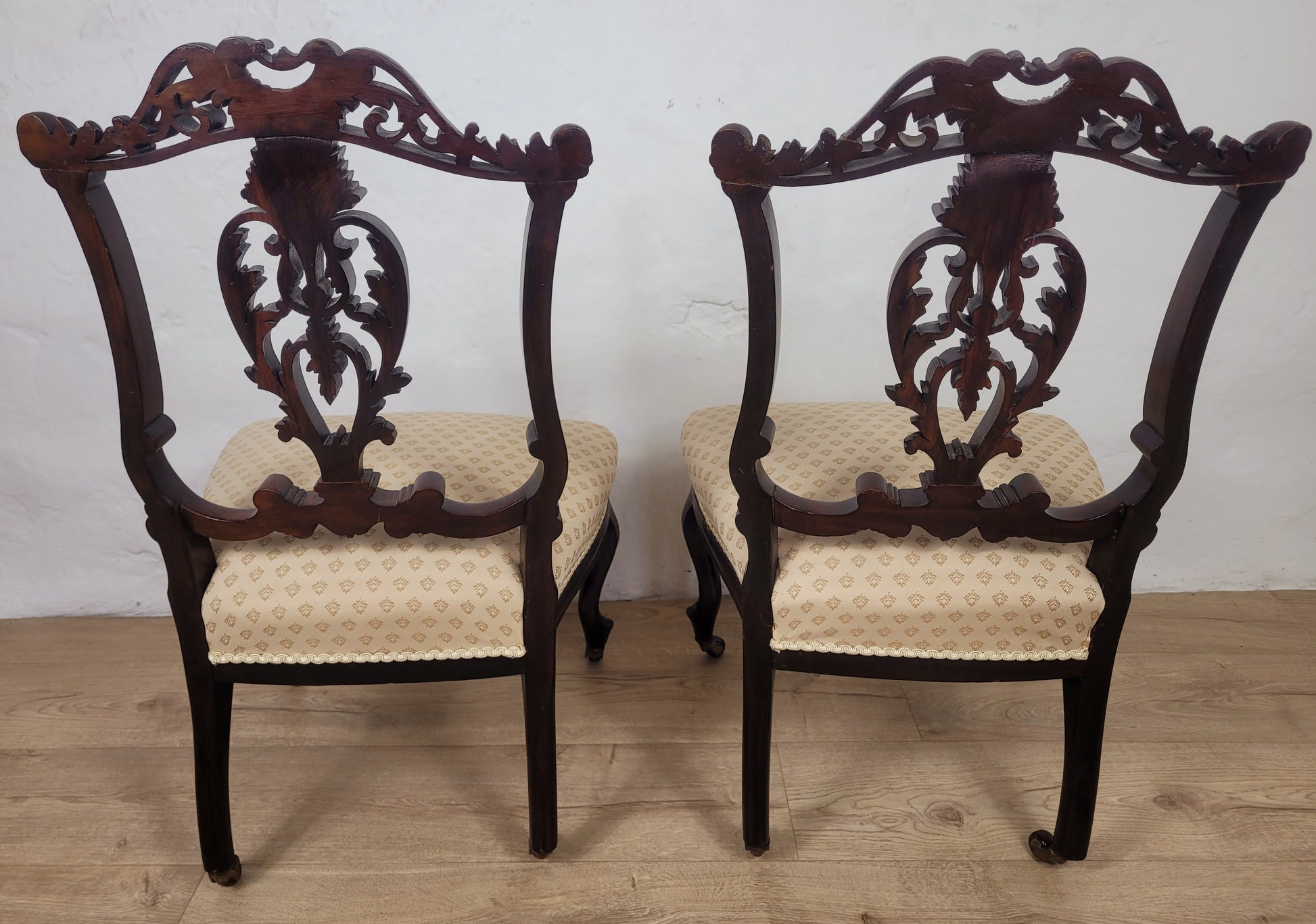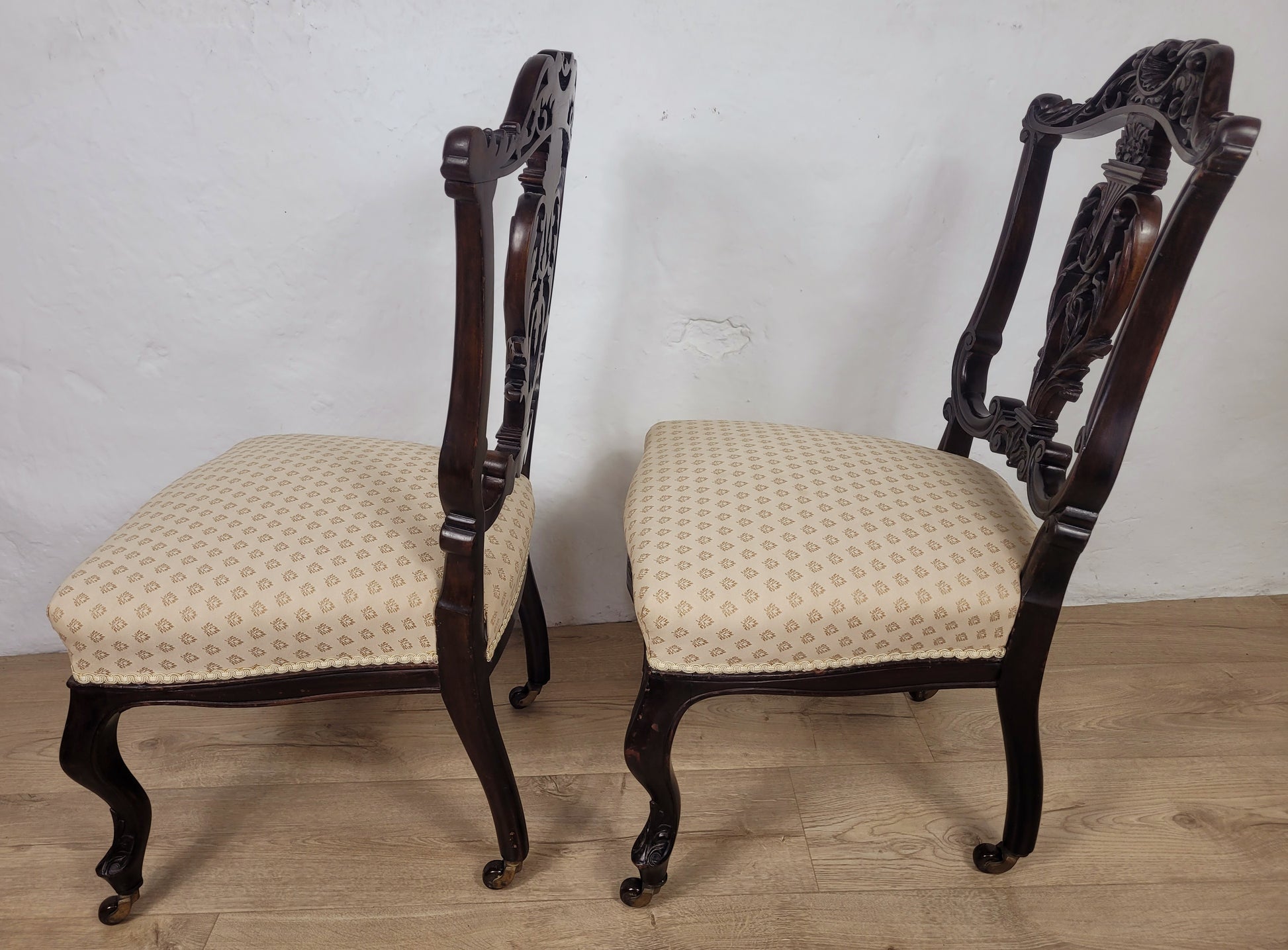 The chairs stand proudly on two front cabriole legs, finished with carved front feet, and two turned back legs.