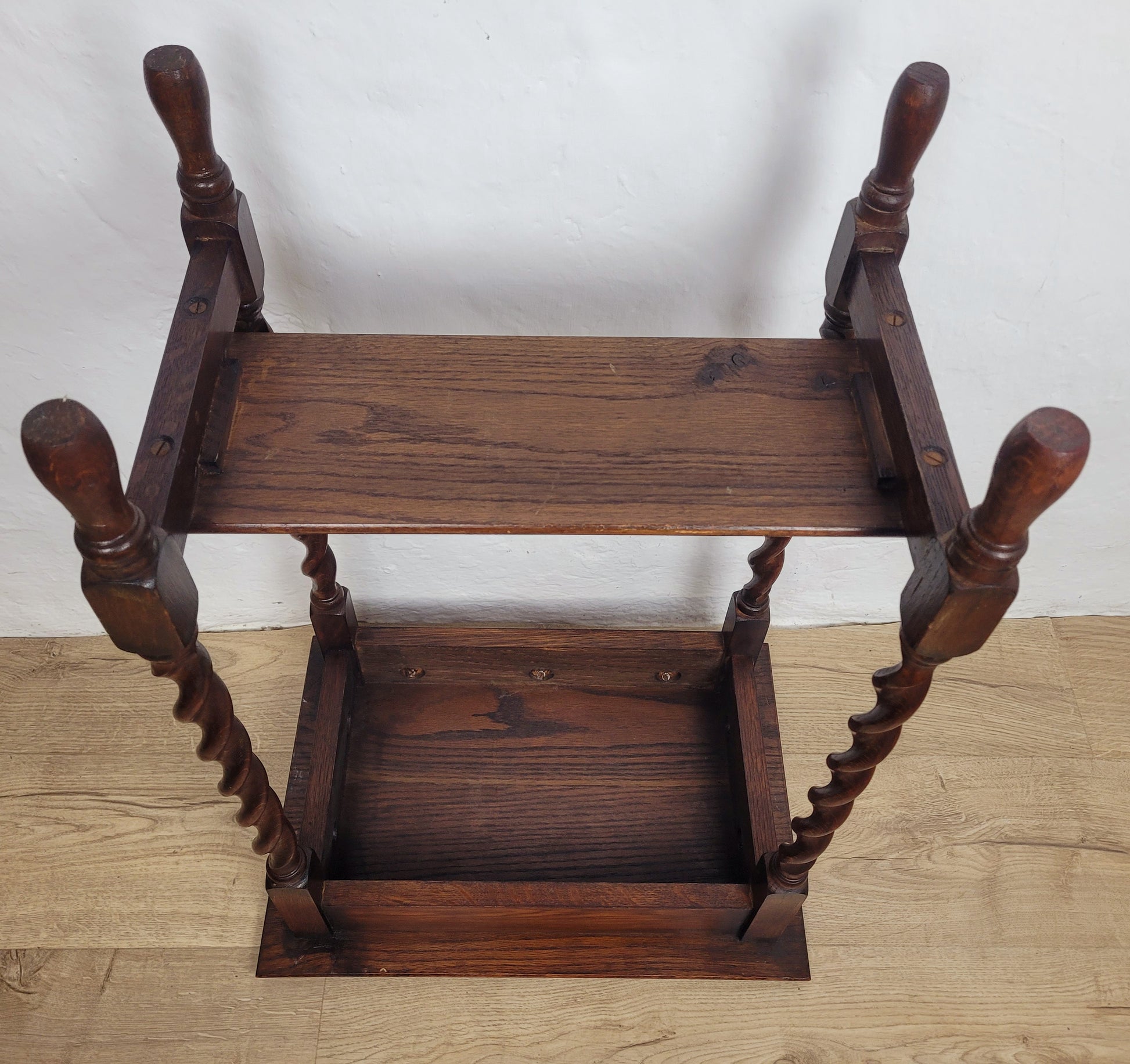 Standing proudly on four excellently carved barley twist legs, finished with circular shaped feet. The legs are all connected by square stretchers and a lower shelf, creating a solid structural frame.