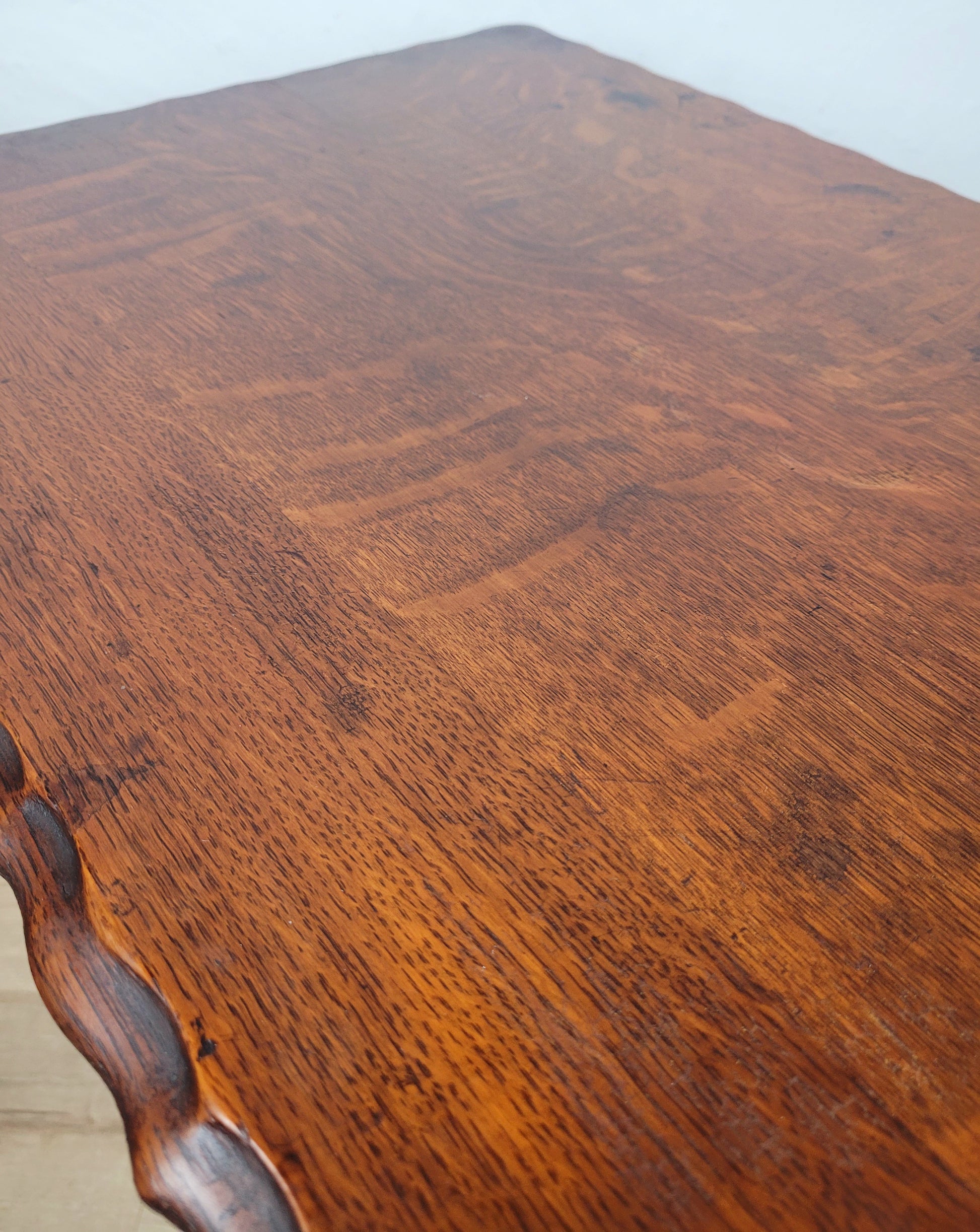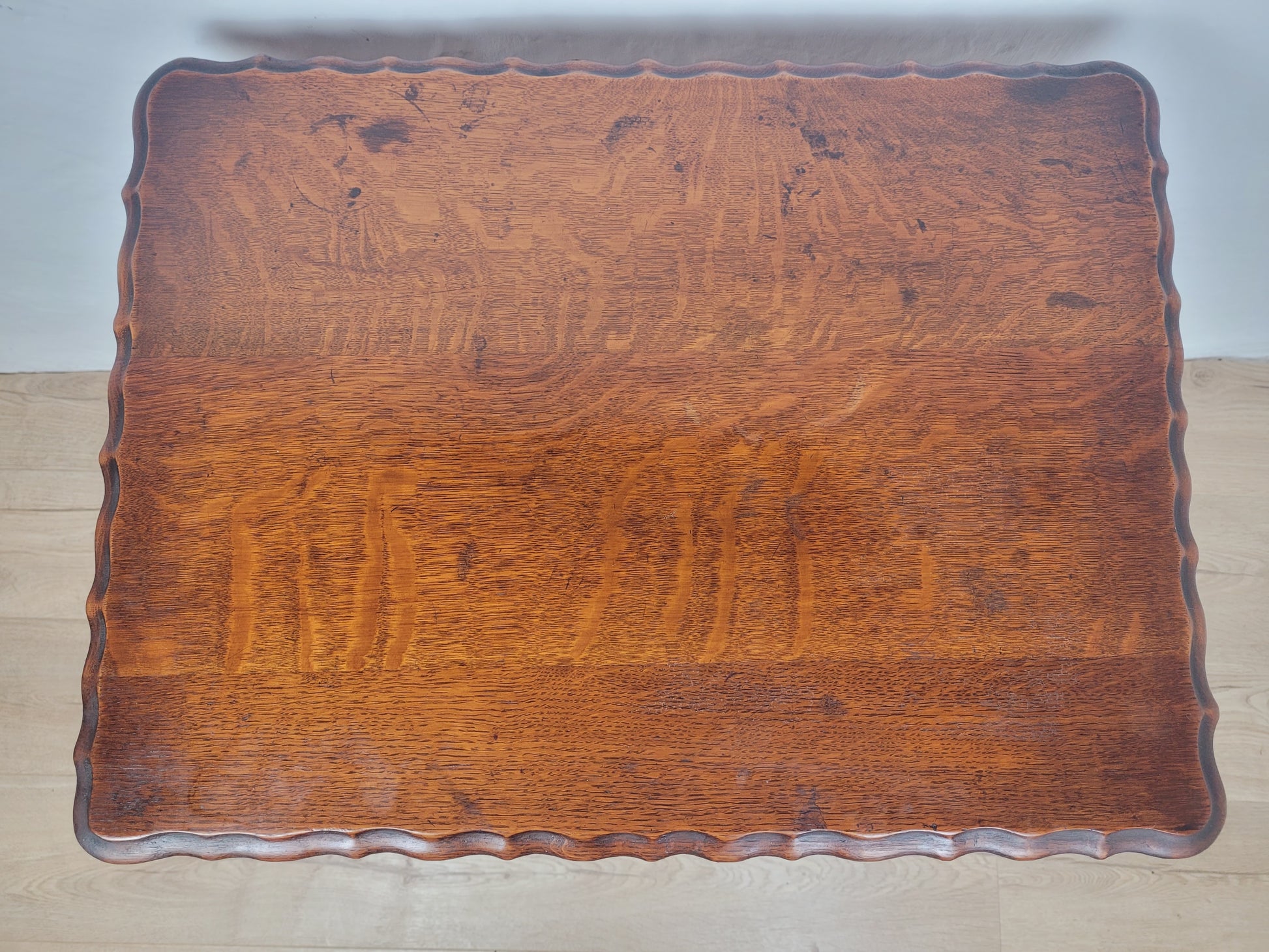 With a wonderful rich mahogany patination to the tabletop. The rectangular tabletop is surrounded with a intricate carved waved boarder.
