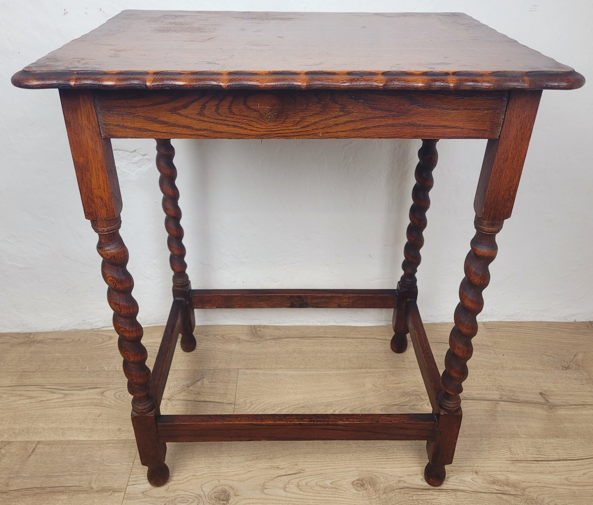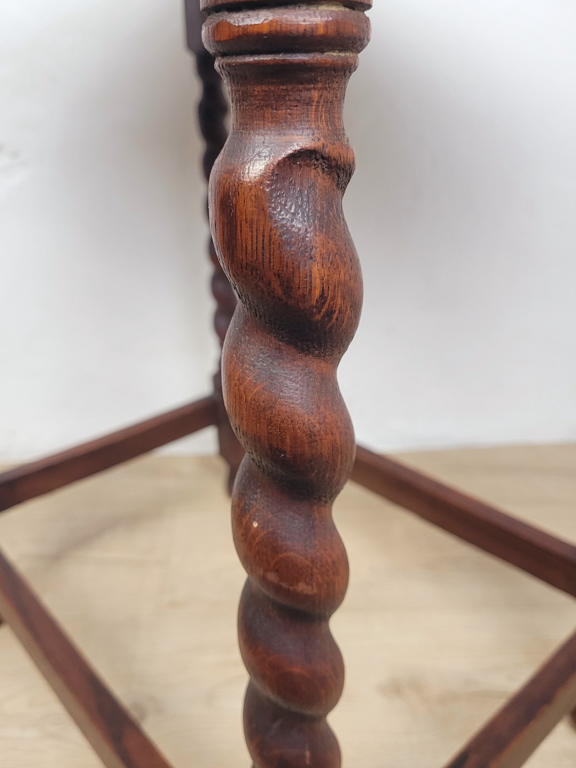 Standing proudly on four excellent curved barley twist legs, finished with circular shaped feet. The legs are all connected by square stretchers, creating a solid structural frame.
