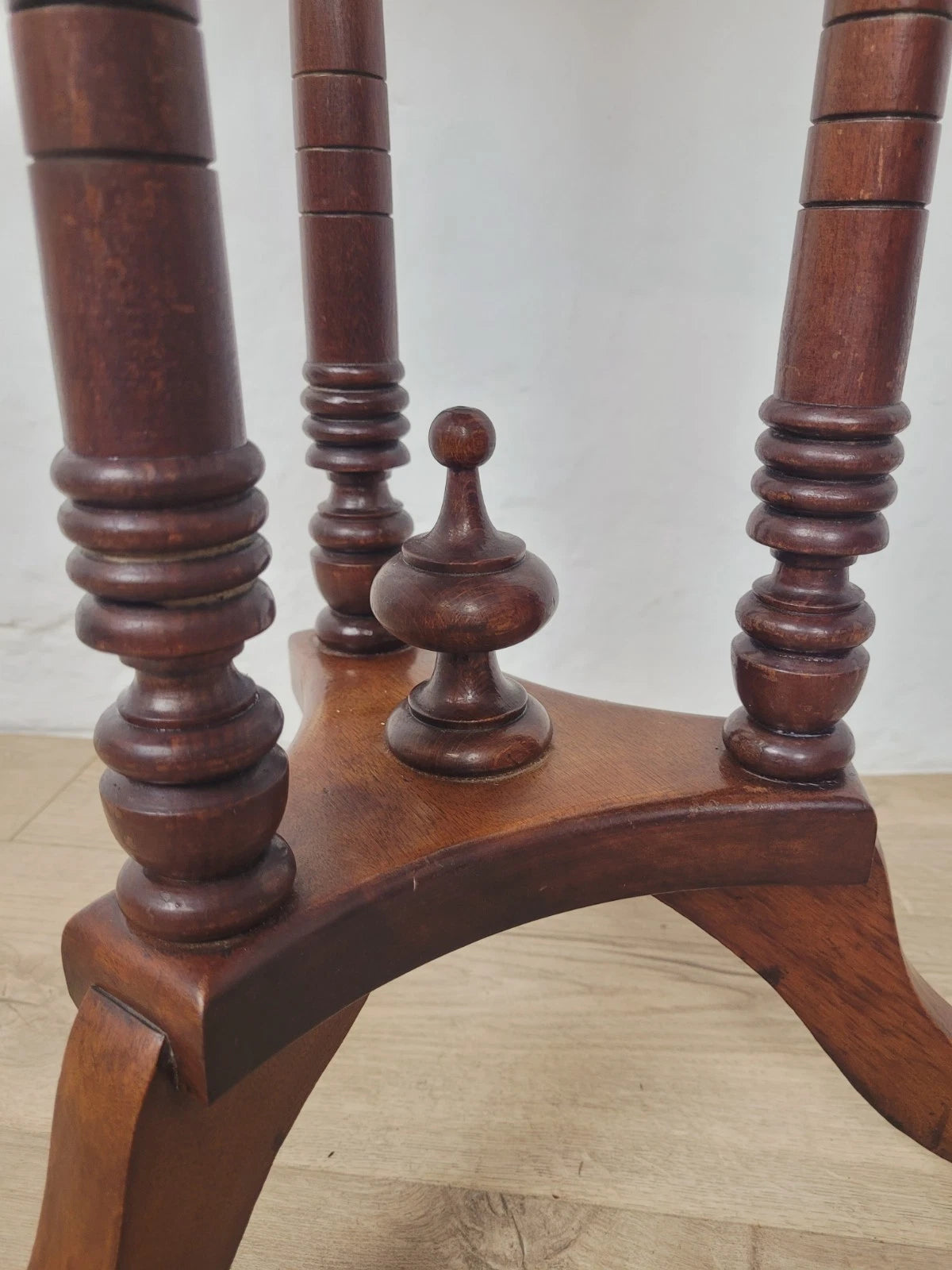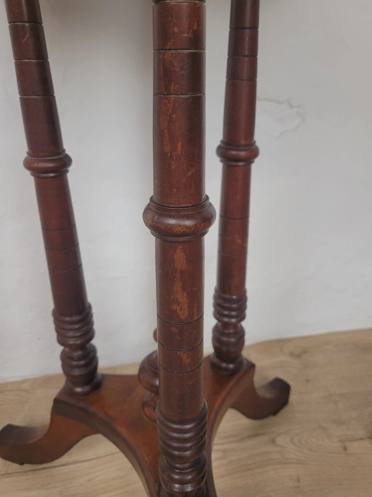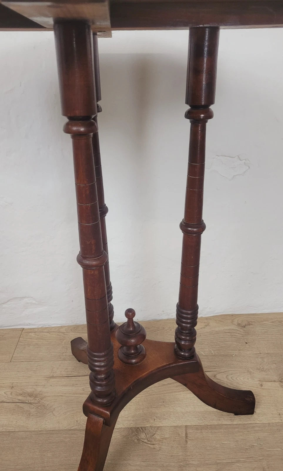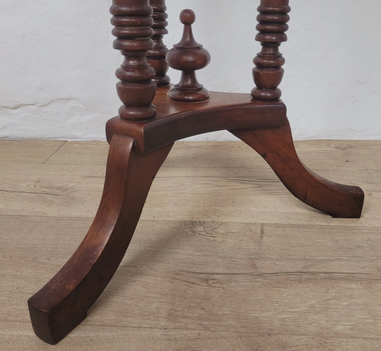 Leading down the table has three turned legs, connected by a lower base. The base has with a wonderful turned finial, and three lower square curved feet to finish.