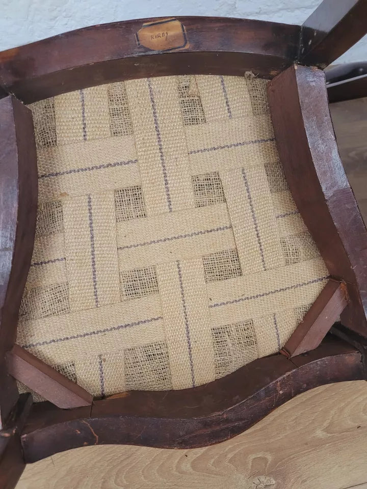 The comfortable horsehair padded seat has been upholstered in a Chenille red surrounded by a matching red brocade boarder.