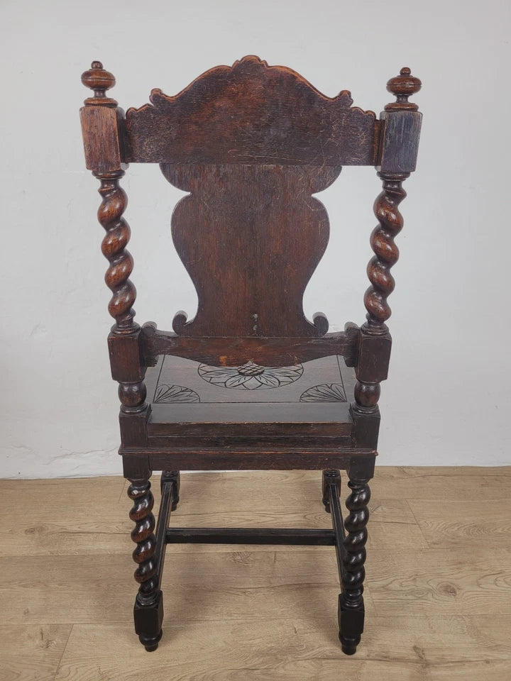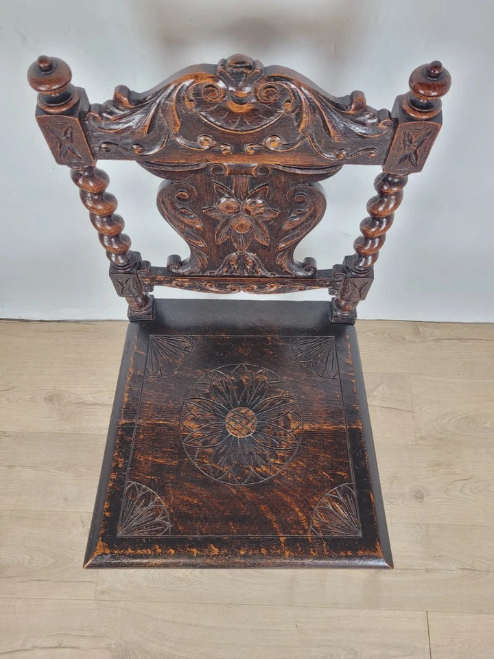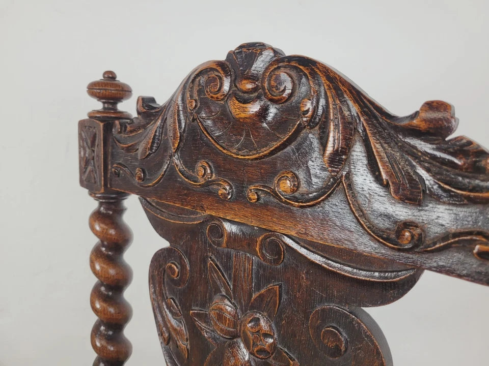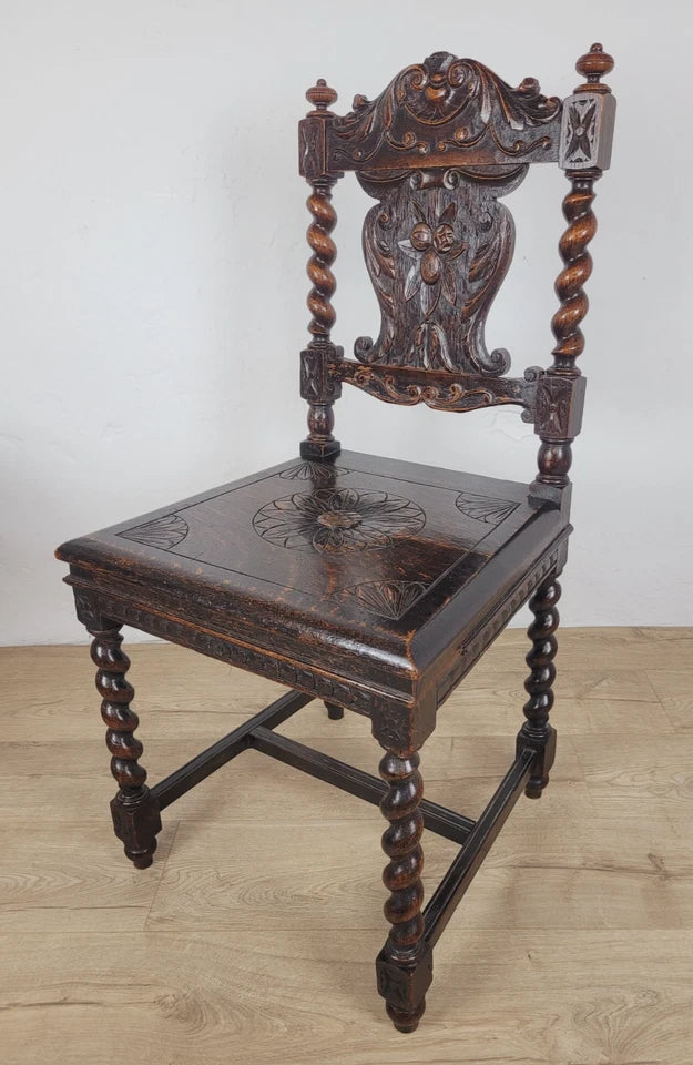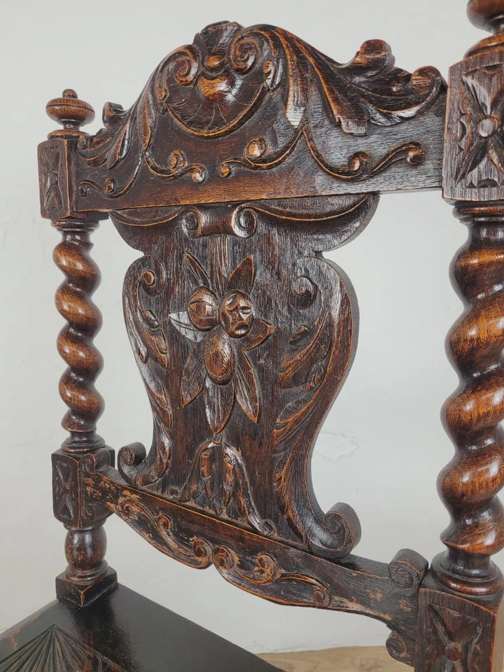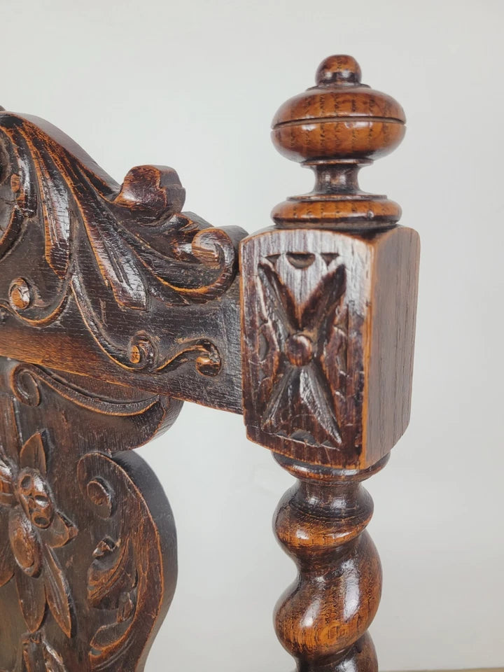 Leading down this chair stands proudly on four excellently bobbin turned legs, that are also finished with floral square carvings.