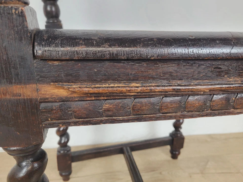 Displaying a rich Oak patination to the hall chair that would provide sophistication to the hallway, kitchen or dining room home setting.