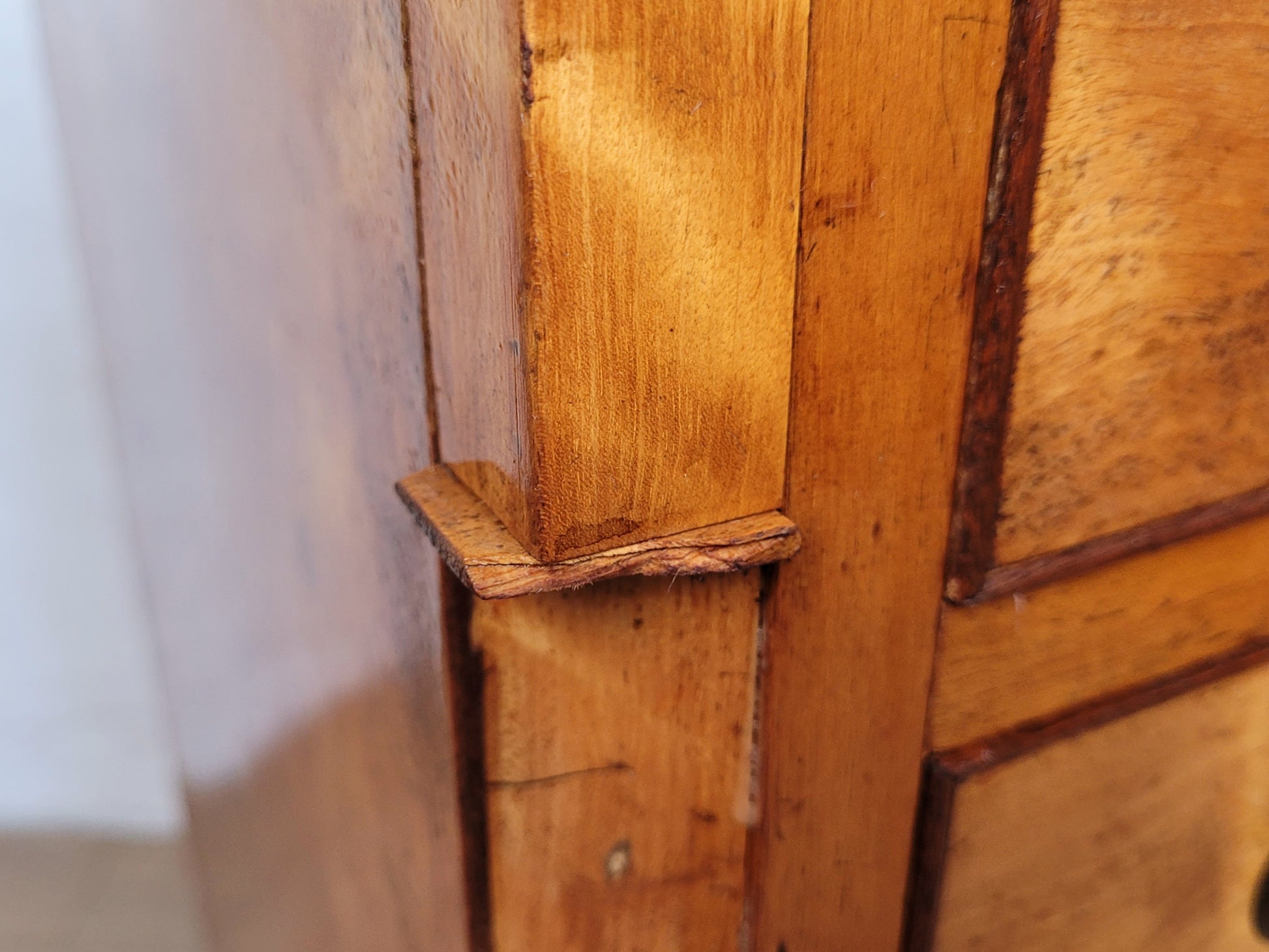 The front of the chest has carved corners and unique square finishes. The squares to the left side show damage (see photographs).