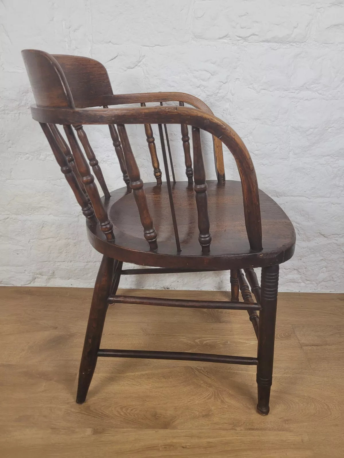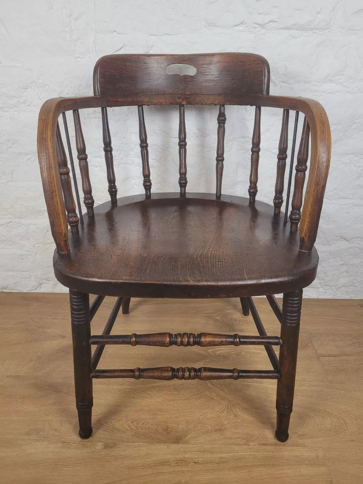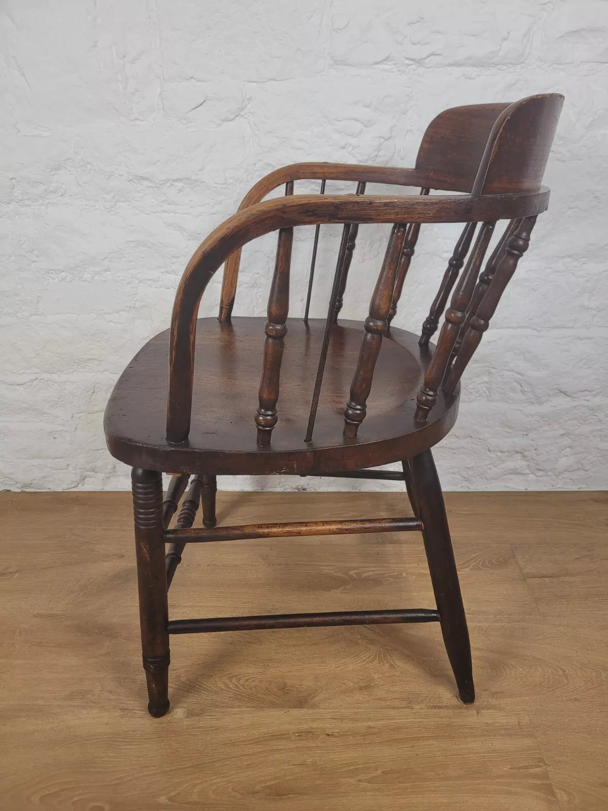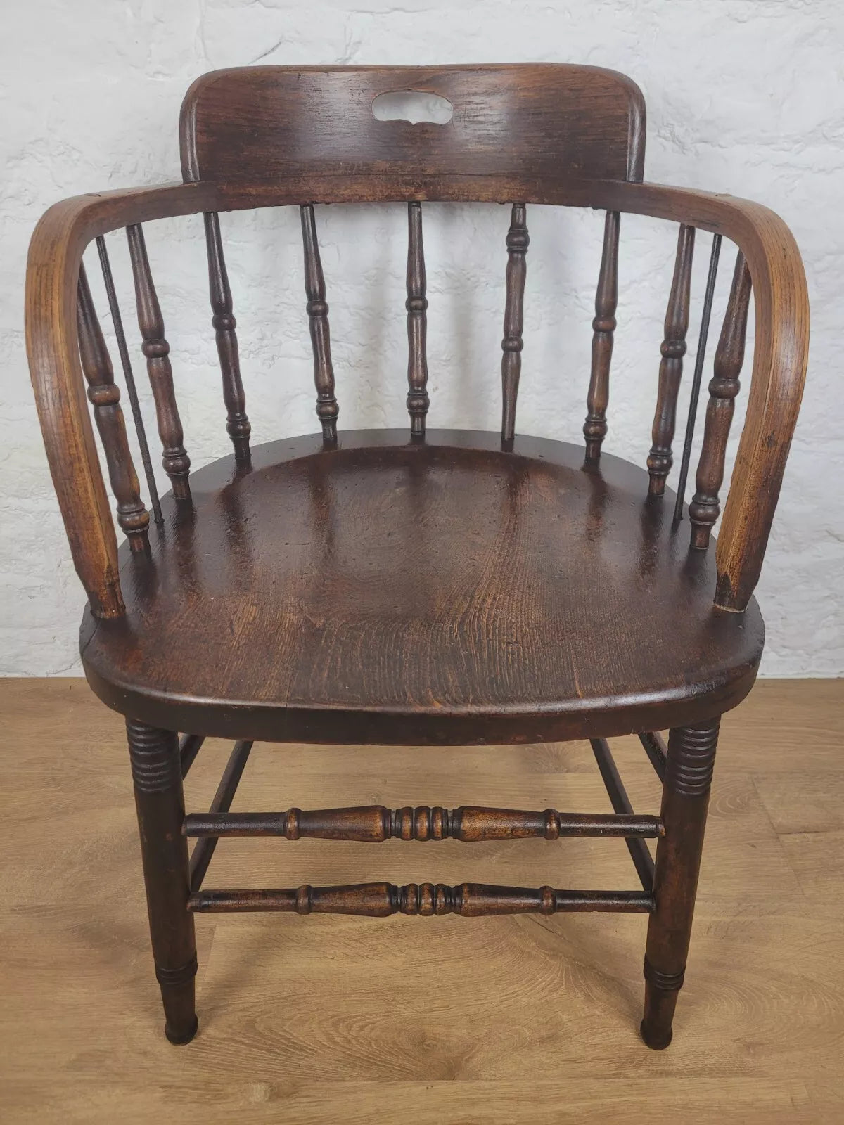 Displaying a beautiful oak patina that highlights the spindles and the gorgeous curved armrests.
