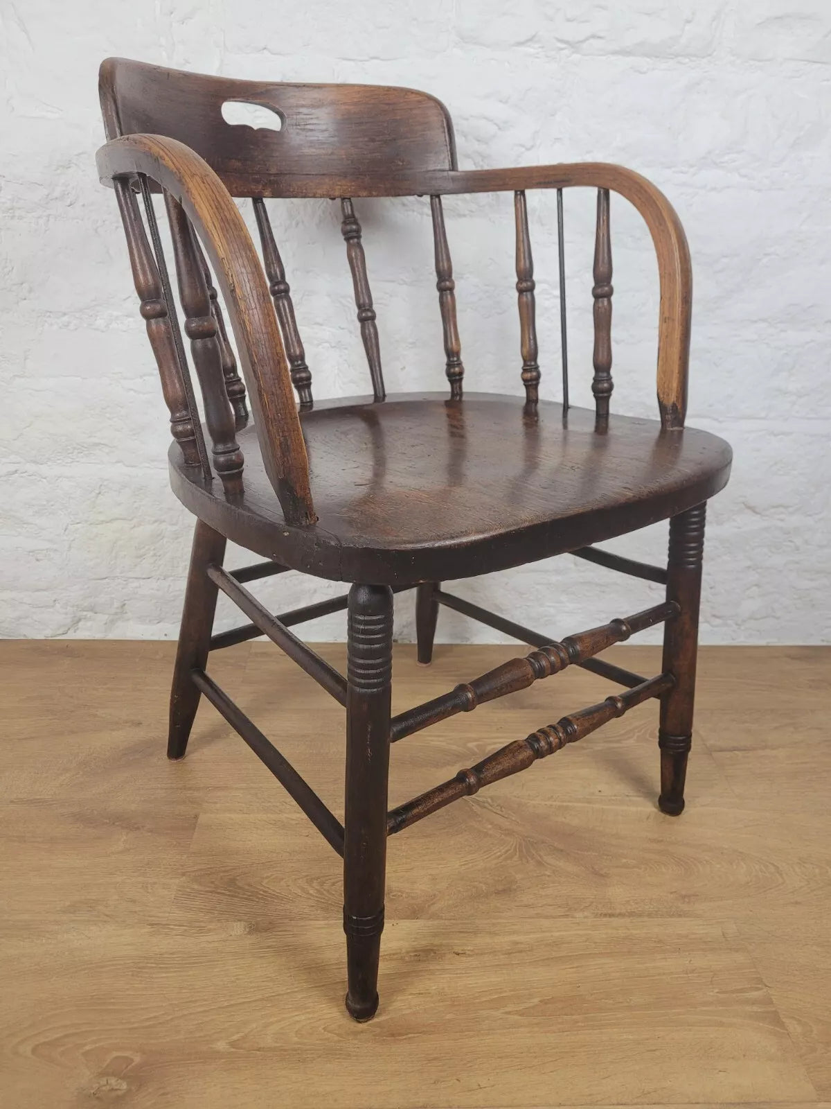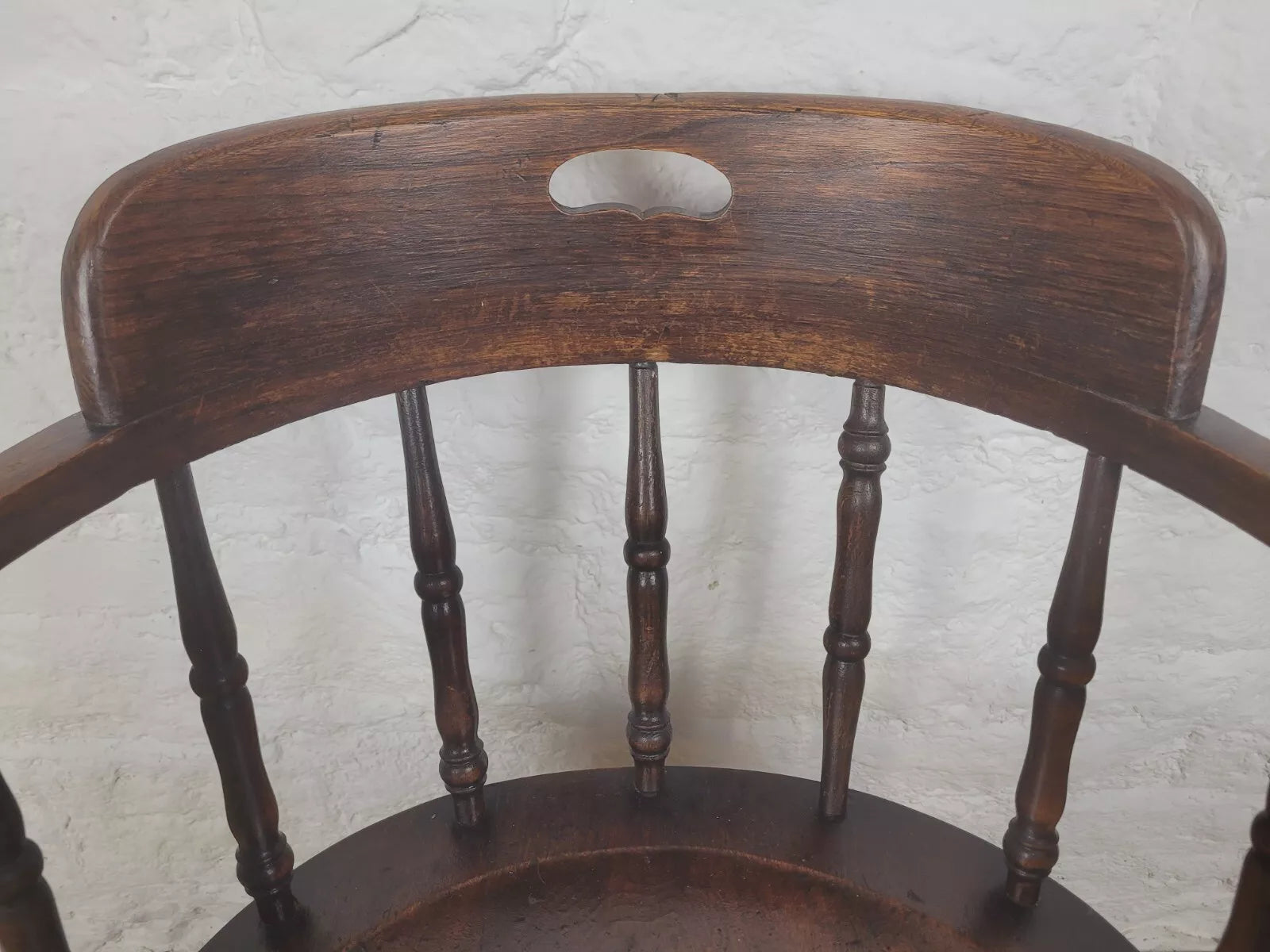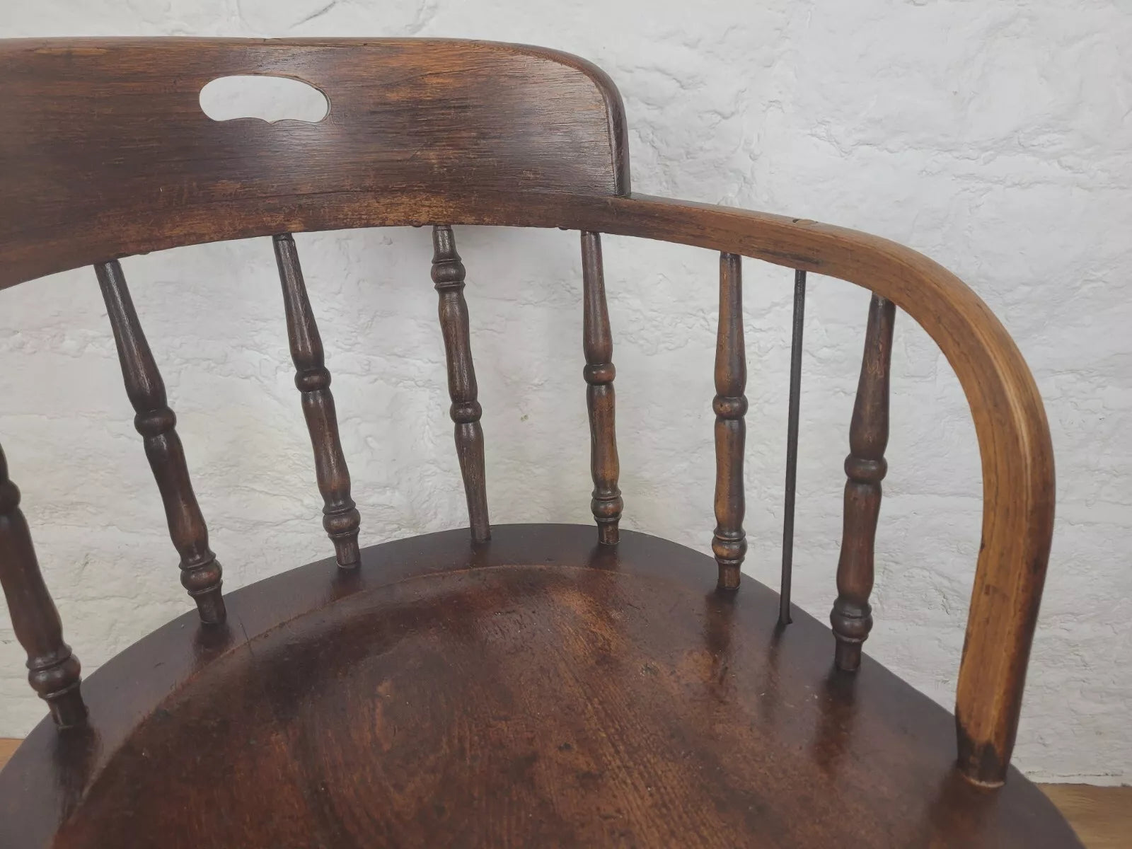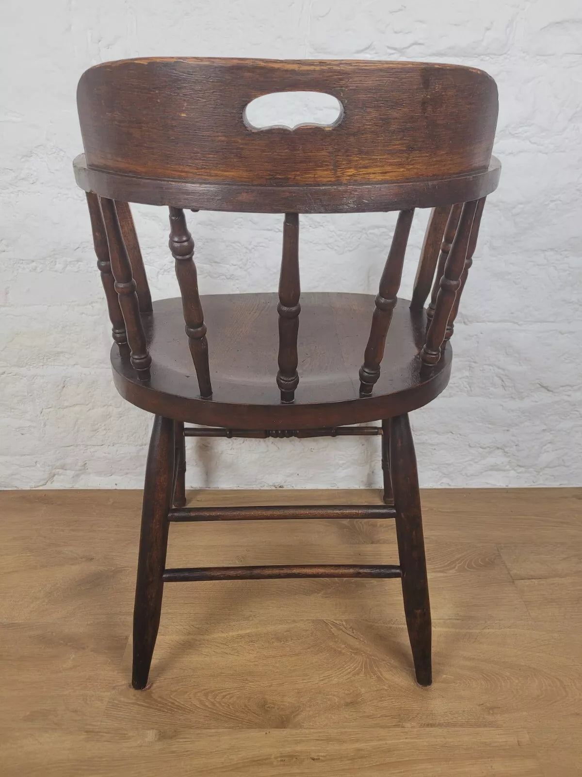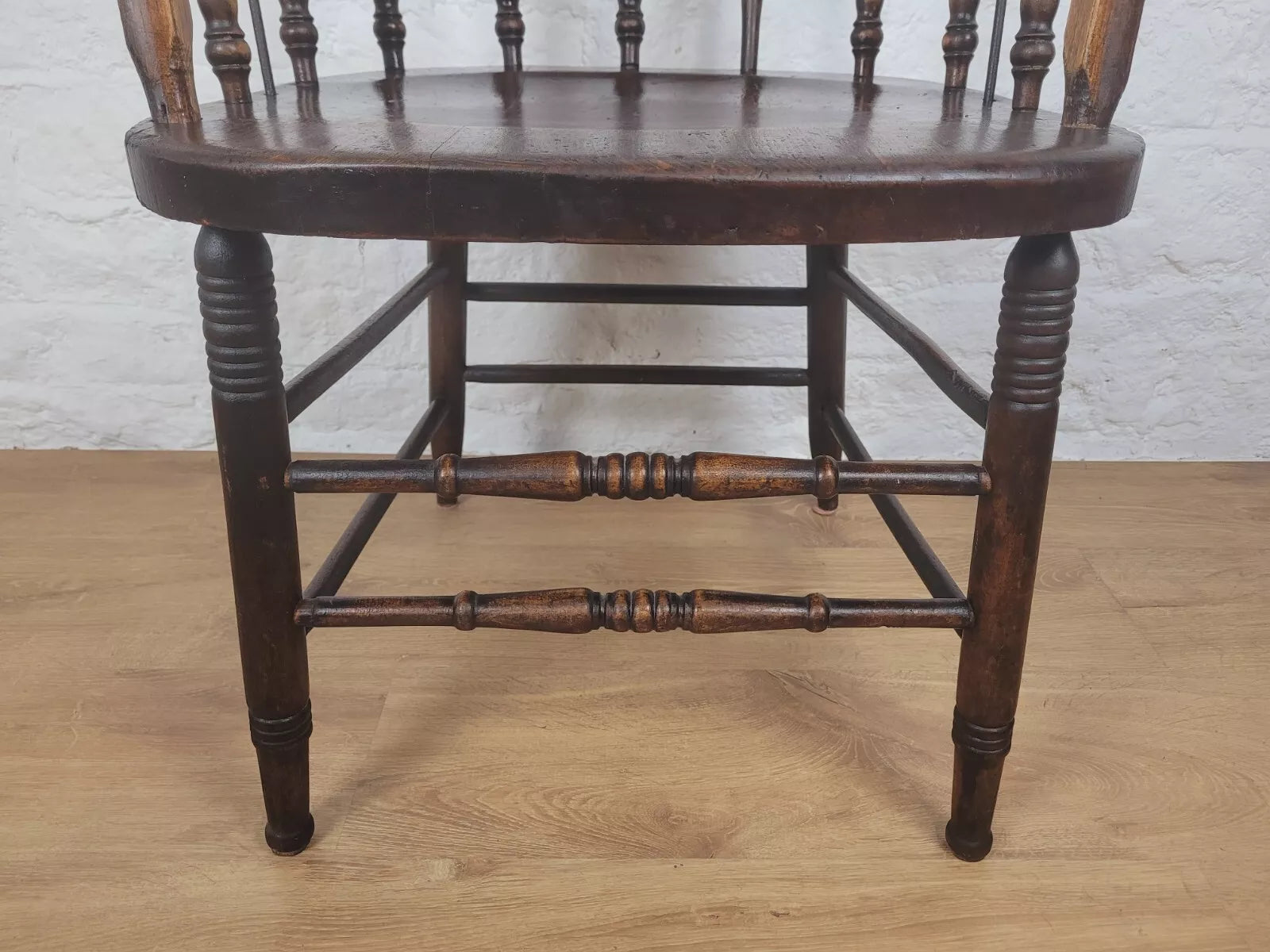 Displaying a beautiful oak patina that highlights the spindles and the gorgeous curved armrests.