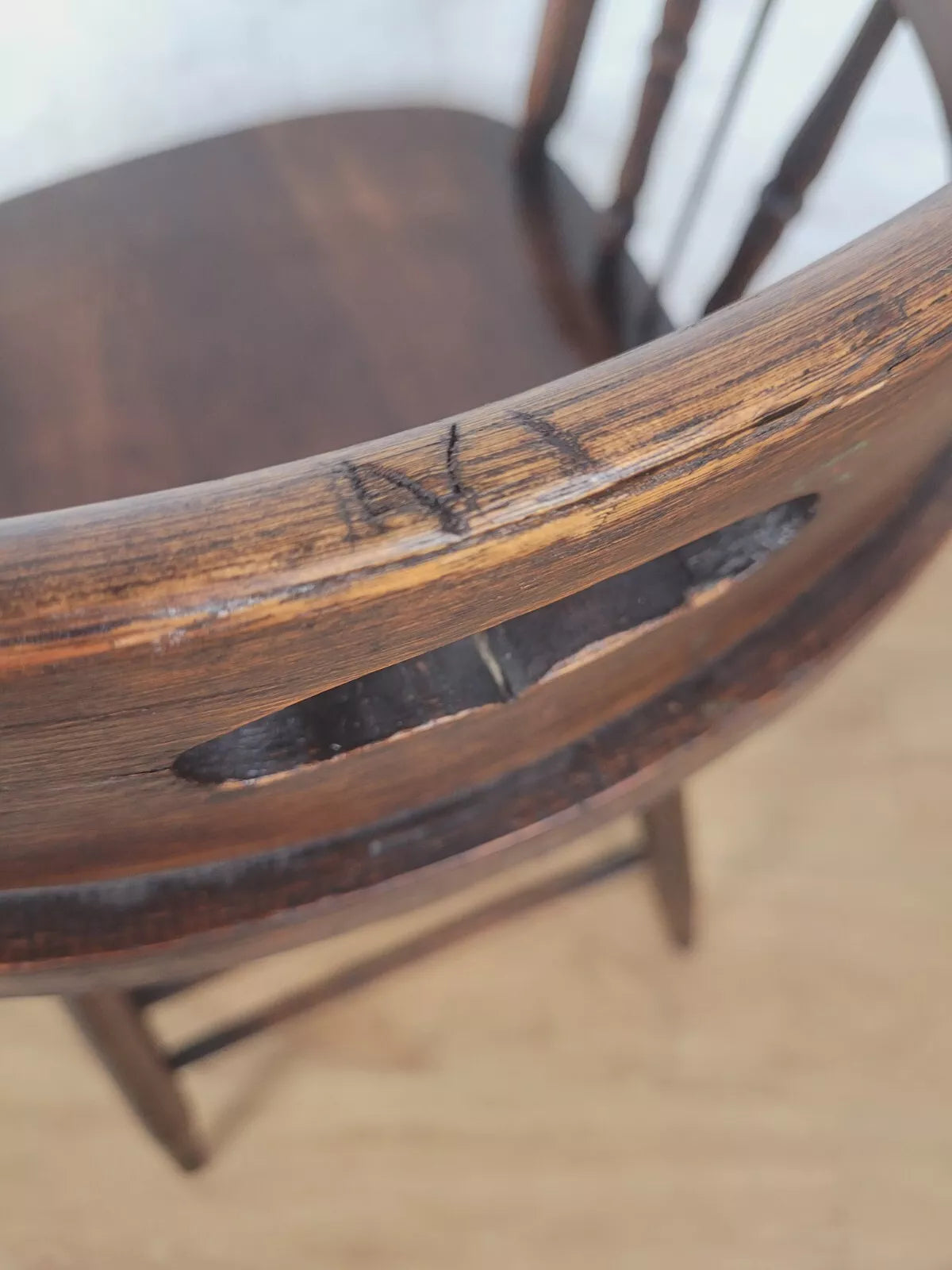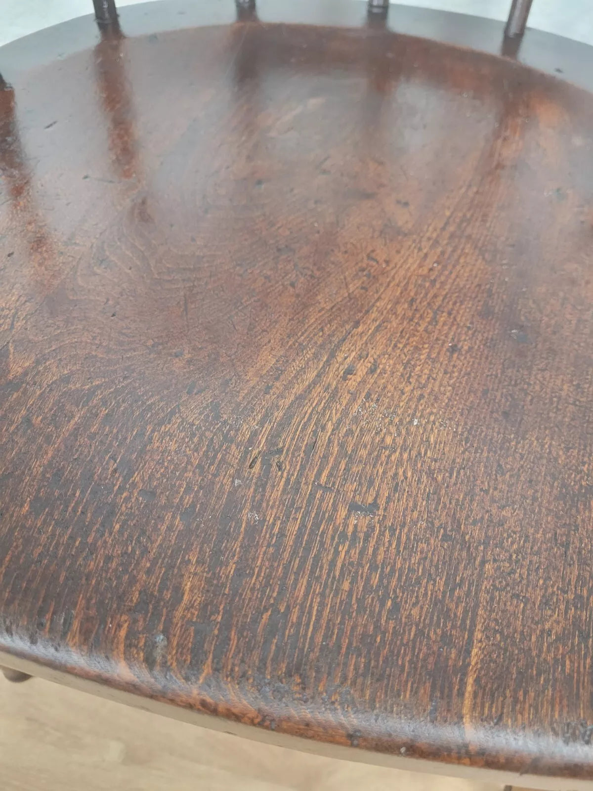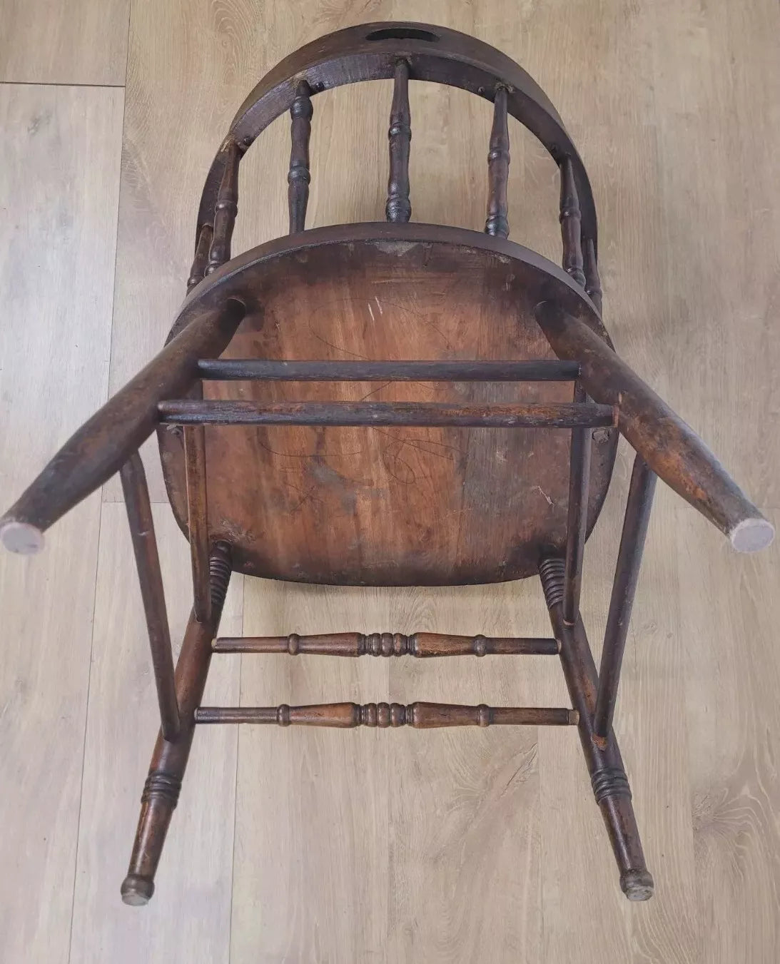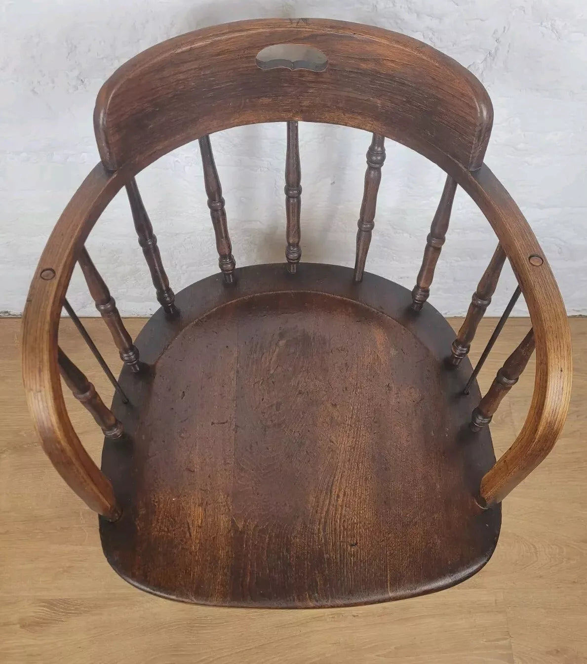 Displaying a beautiful oak patina that highlights the spindles and the gorgeous curved armrests.