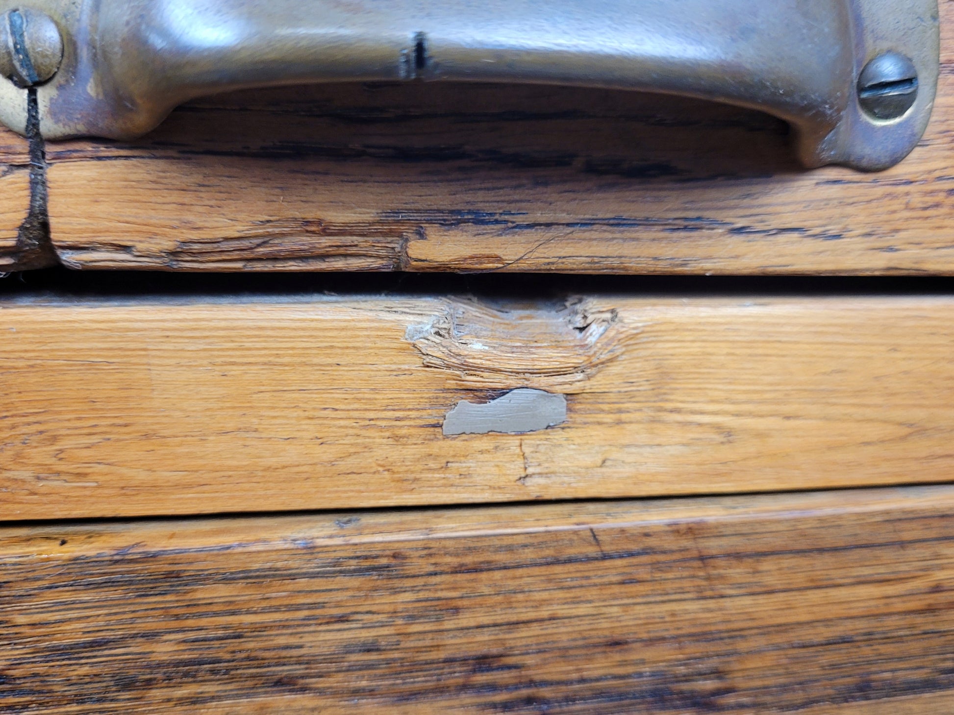 There is a historical wood filler to the desk top (see photograph).