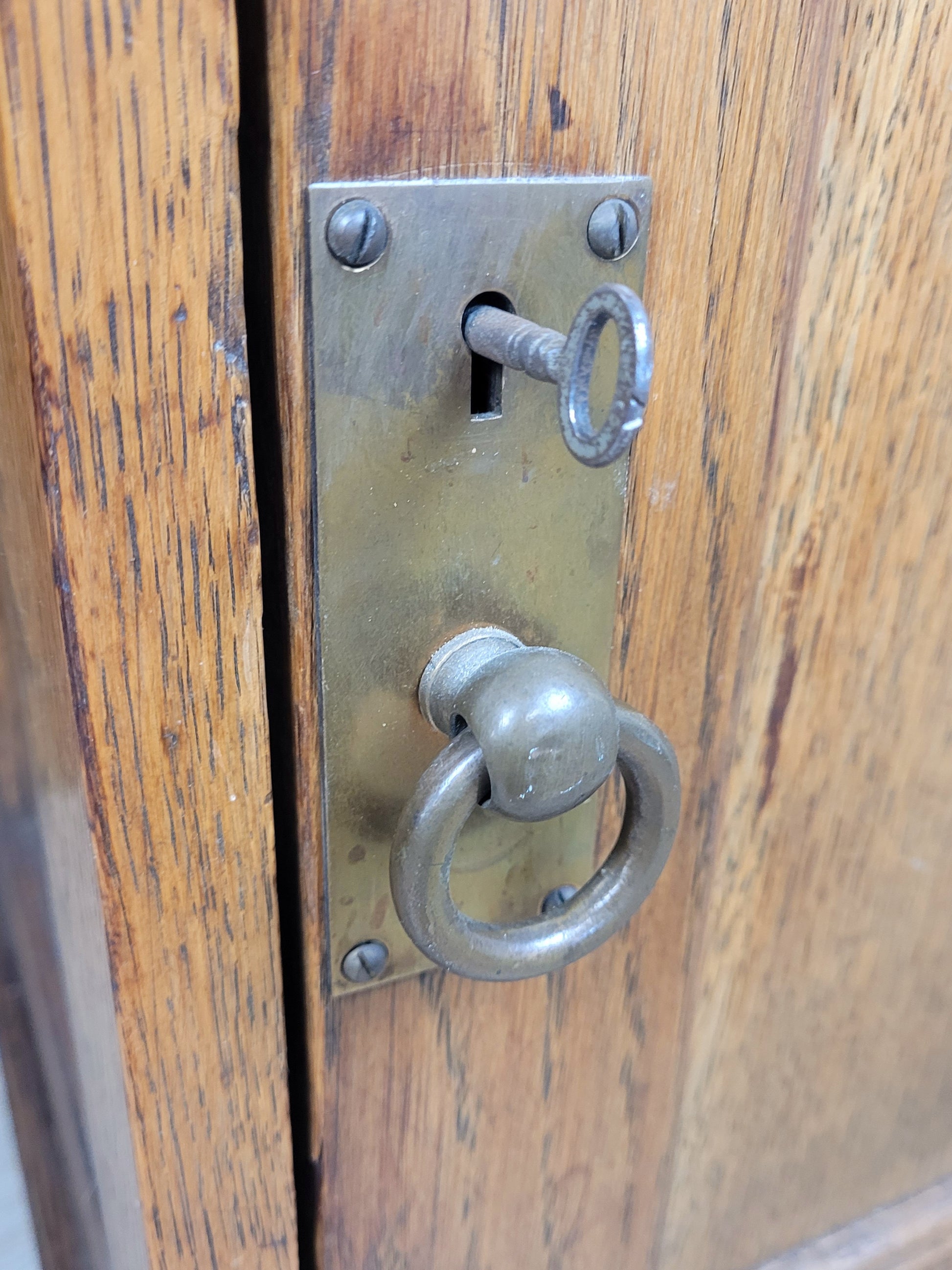 The drawer is finished with a gorgeous metal domed handle, and a unique screwing locking mechanism to the left side of the desk to lock the drawer. There is a lock to the door with the key present, to keep the interior safely locked.