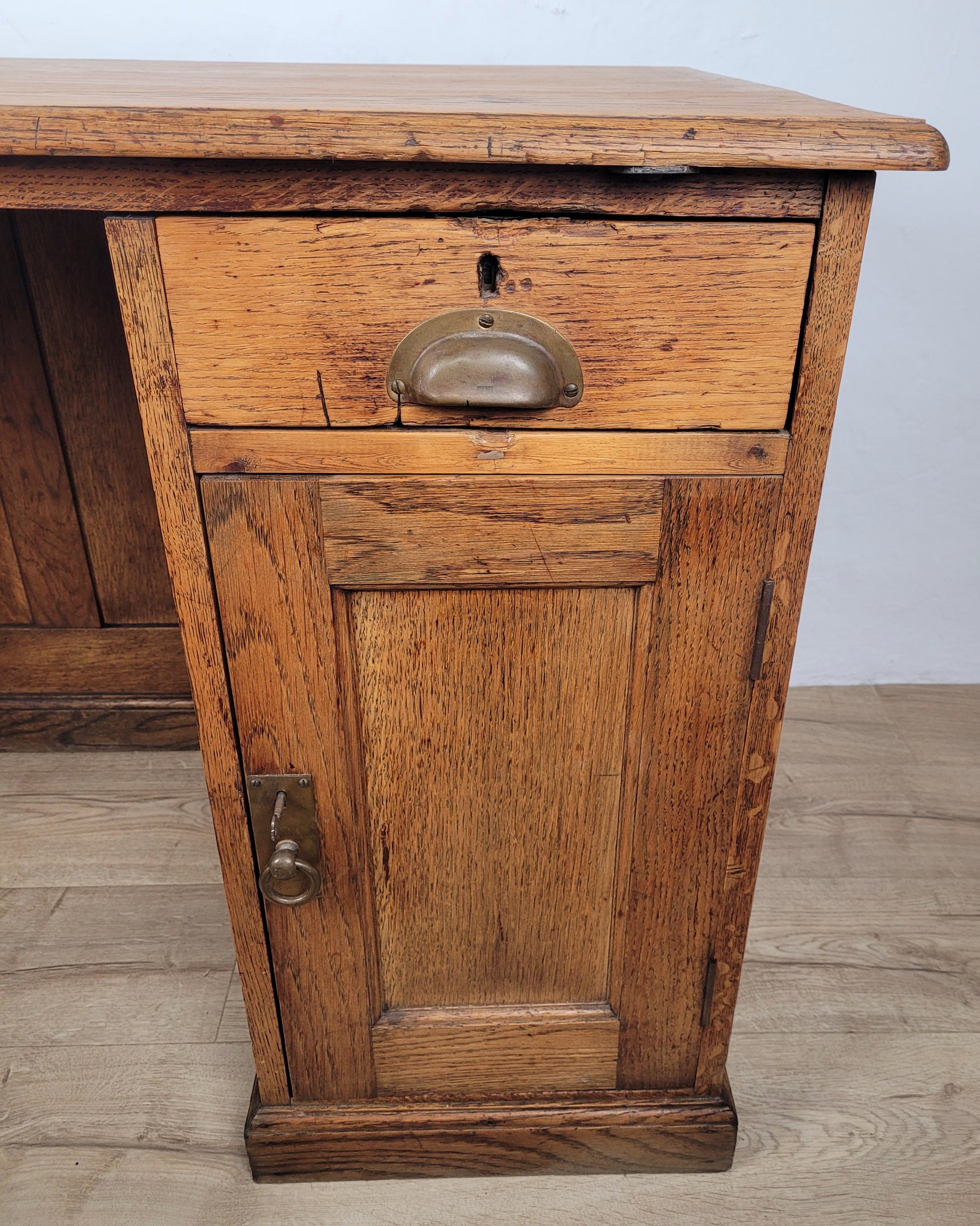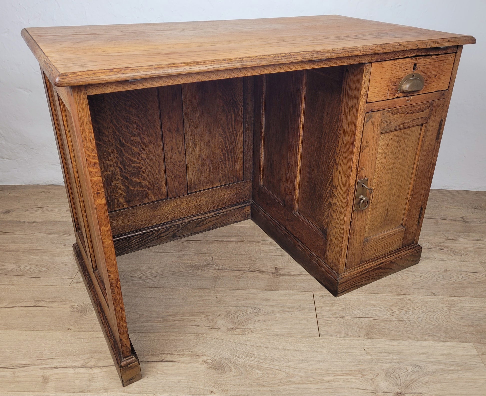 The desk has a single pedestal, which holds a large spacious drawer and a front door with a single shelf to the interior.