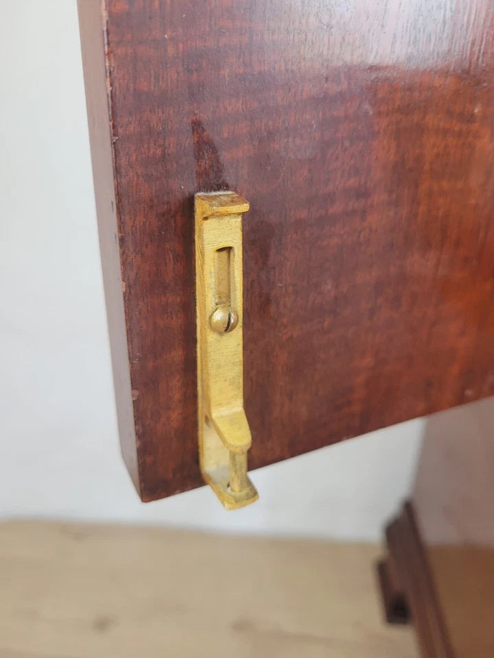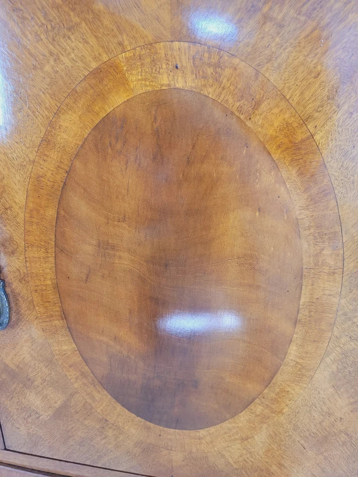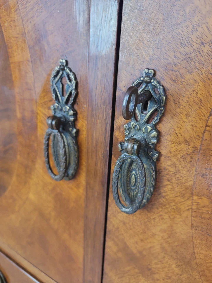 The gorgeous walnut veneered doors can be opened from both sides with metal oval drop handles. The left door has a latch that can be locked, and the right door has a working lock and key.