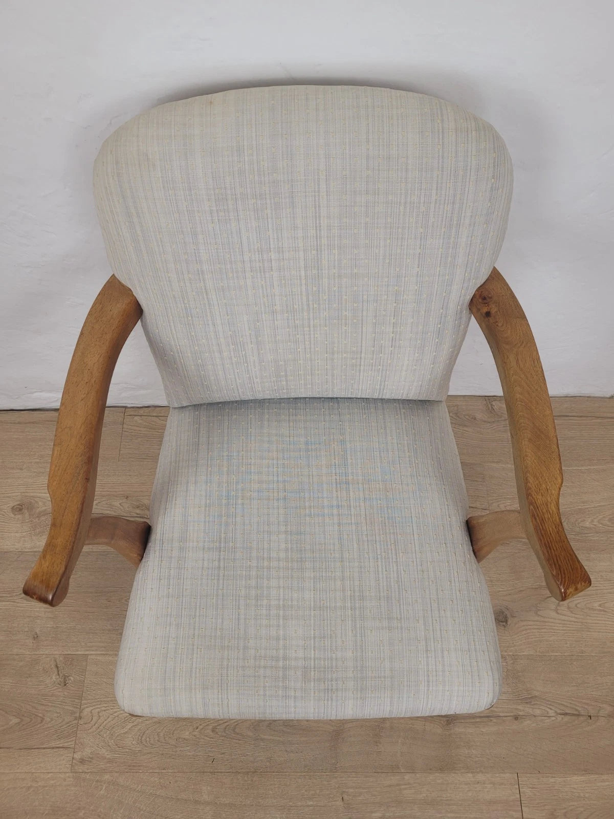 The backrest holds the elegantly curved walnut armrests that connect down at the side of the chair.