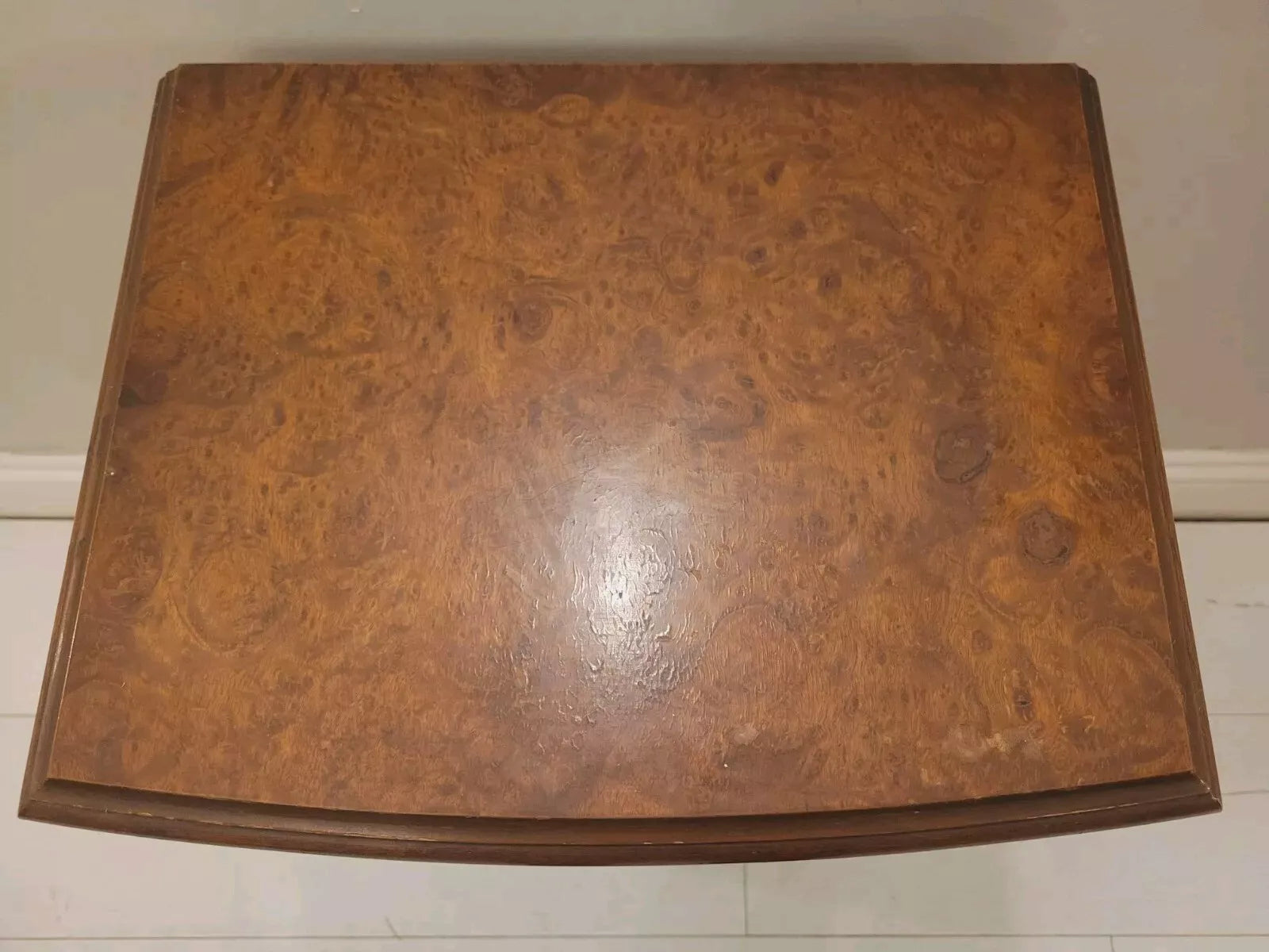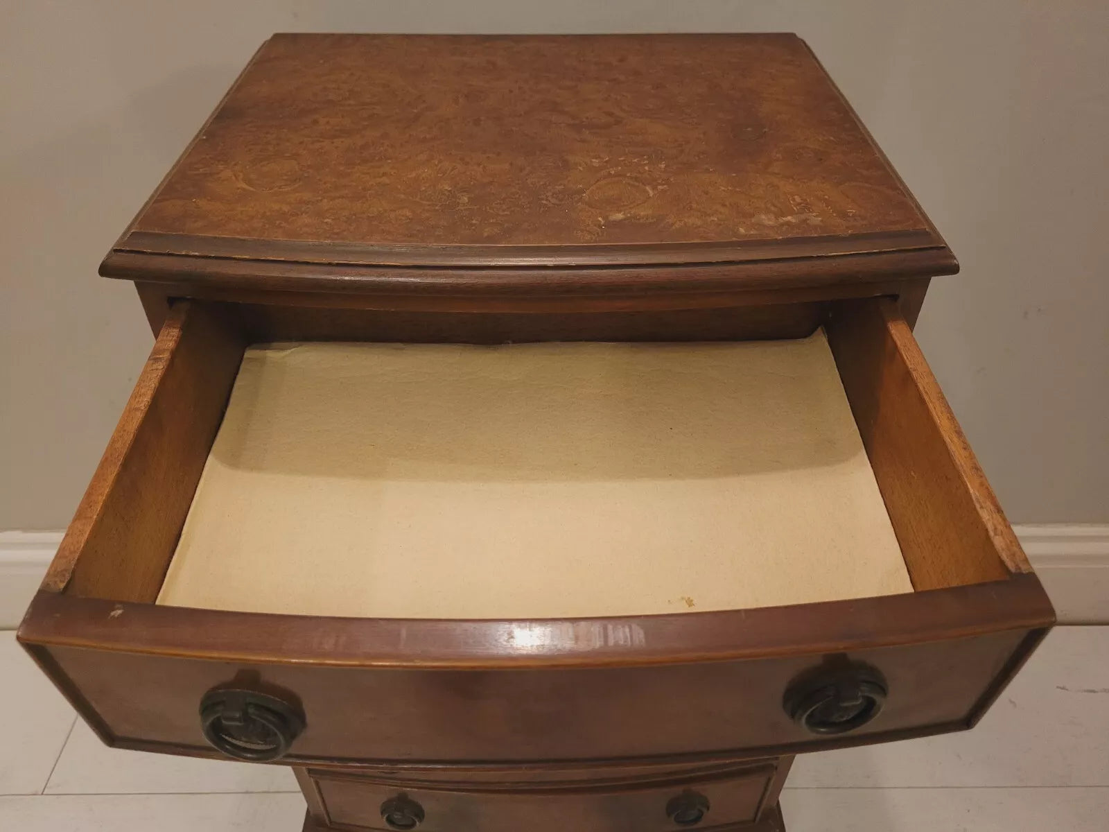 This is a gorgeous vintage walnut chest of drawers that has an excellent curved shaped front, constructed in the 1930's.