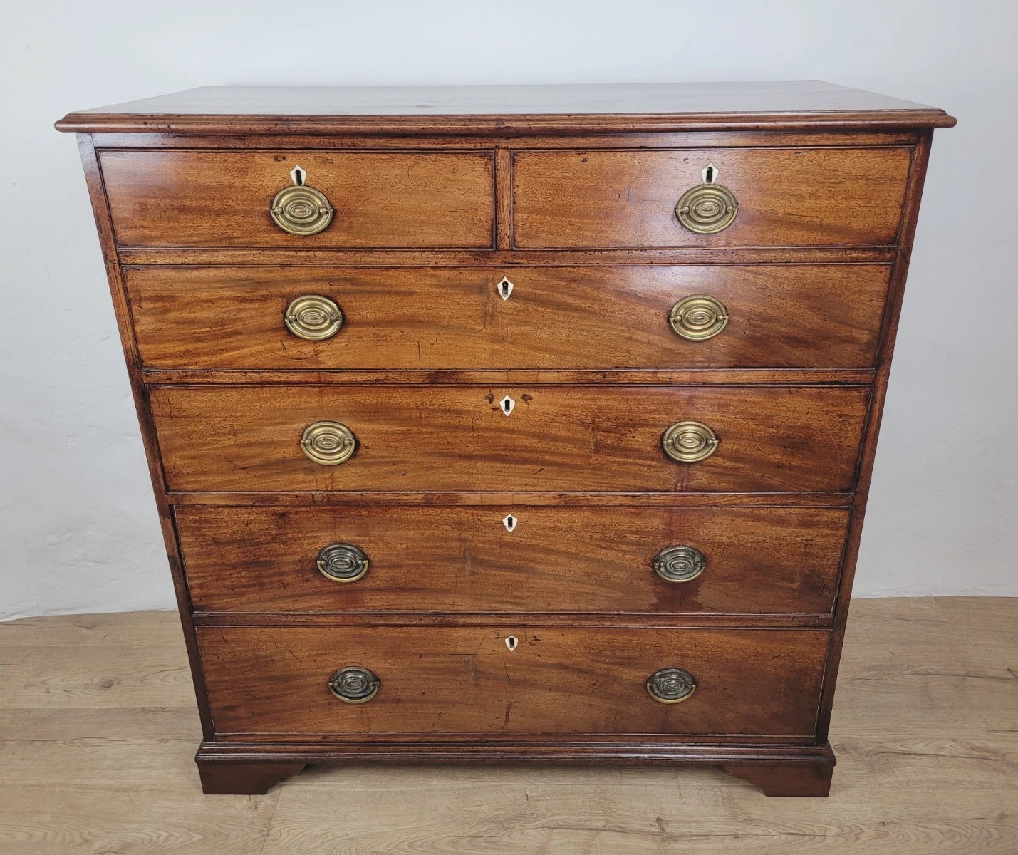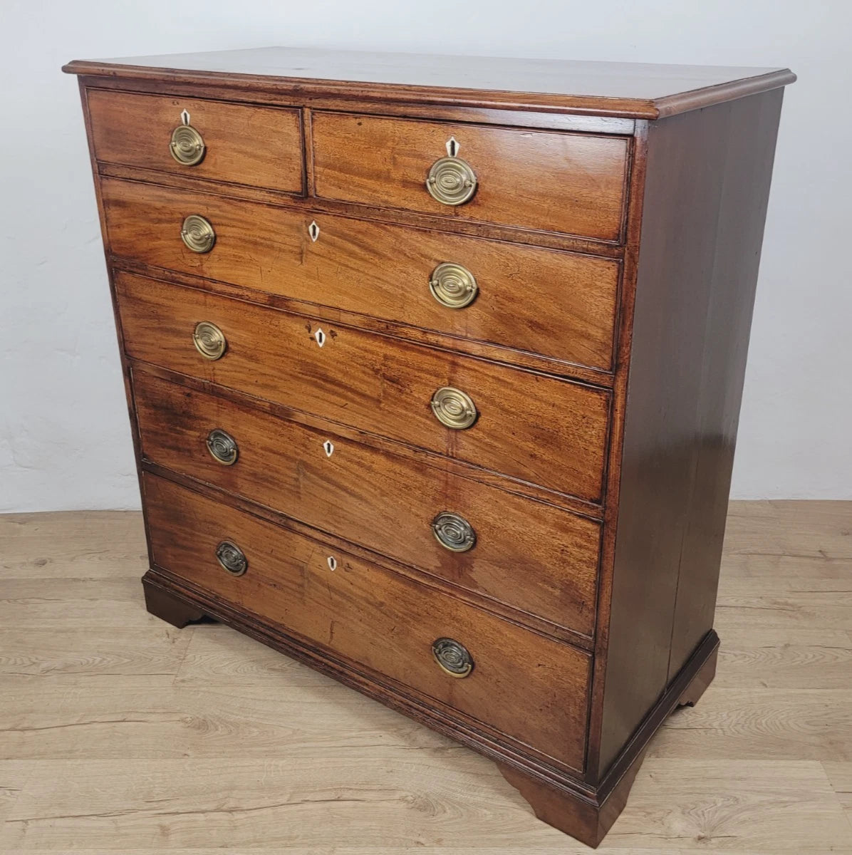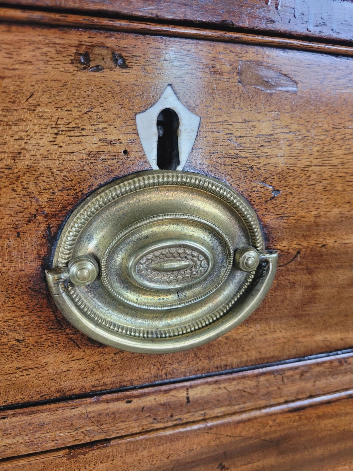 The chest front has an excellent arrangement of two short over four large graduating drawers. Each drawer has striking matching oval brass drop handles, with a raised boarder to finish. The drawers have gorgeous shield shaped key holes to the drawers, unfortunately there is no key, but this does not effect the functionality of the item at all.
