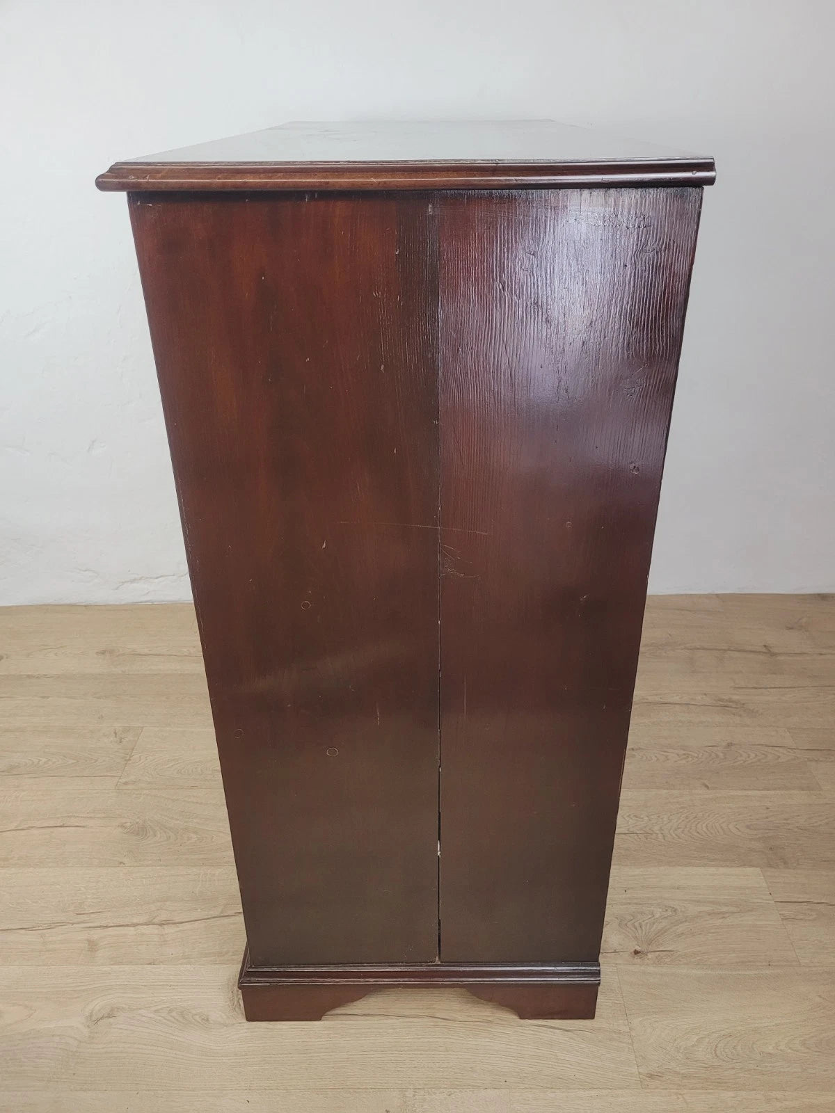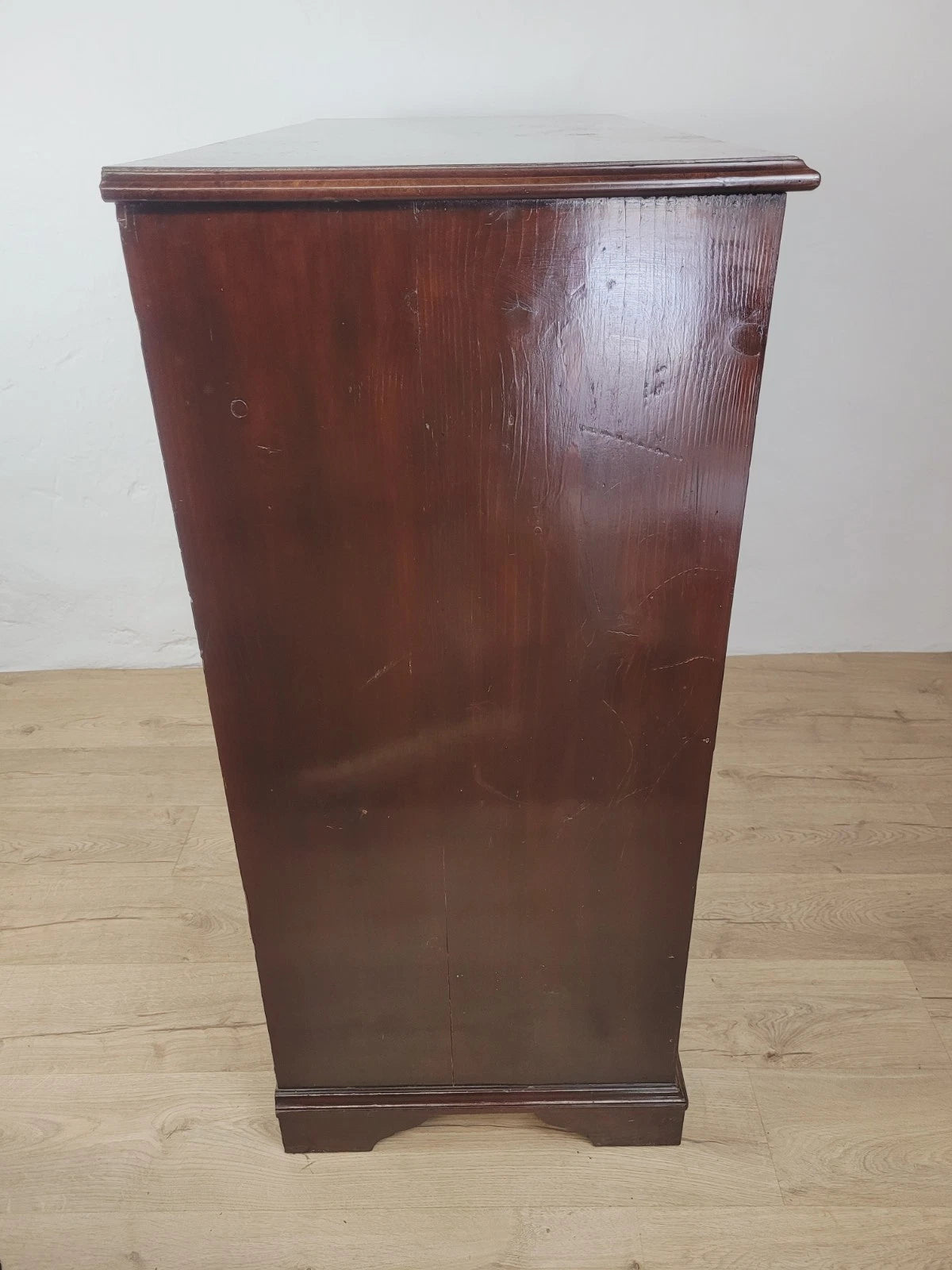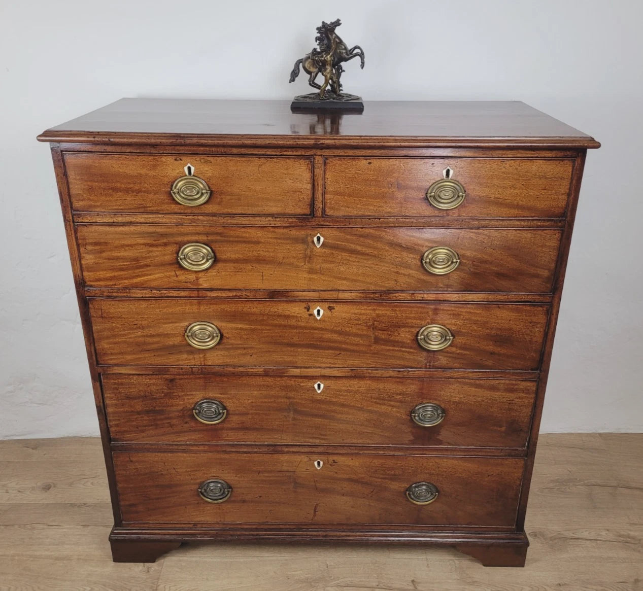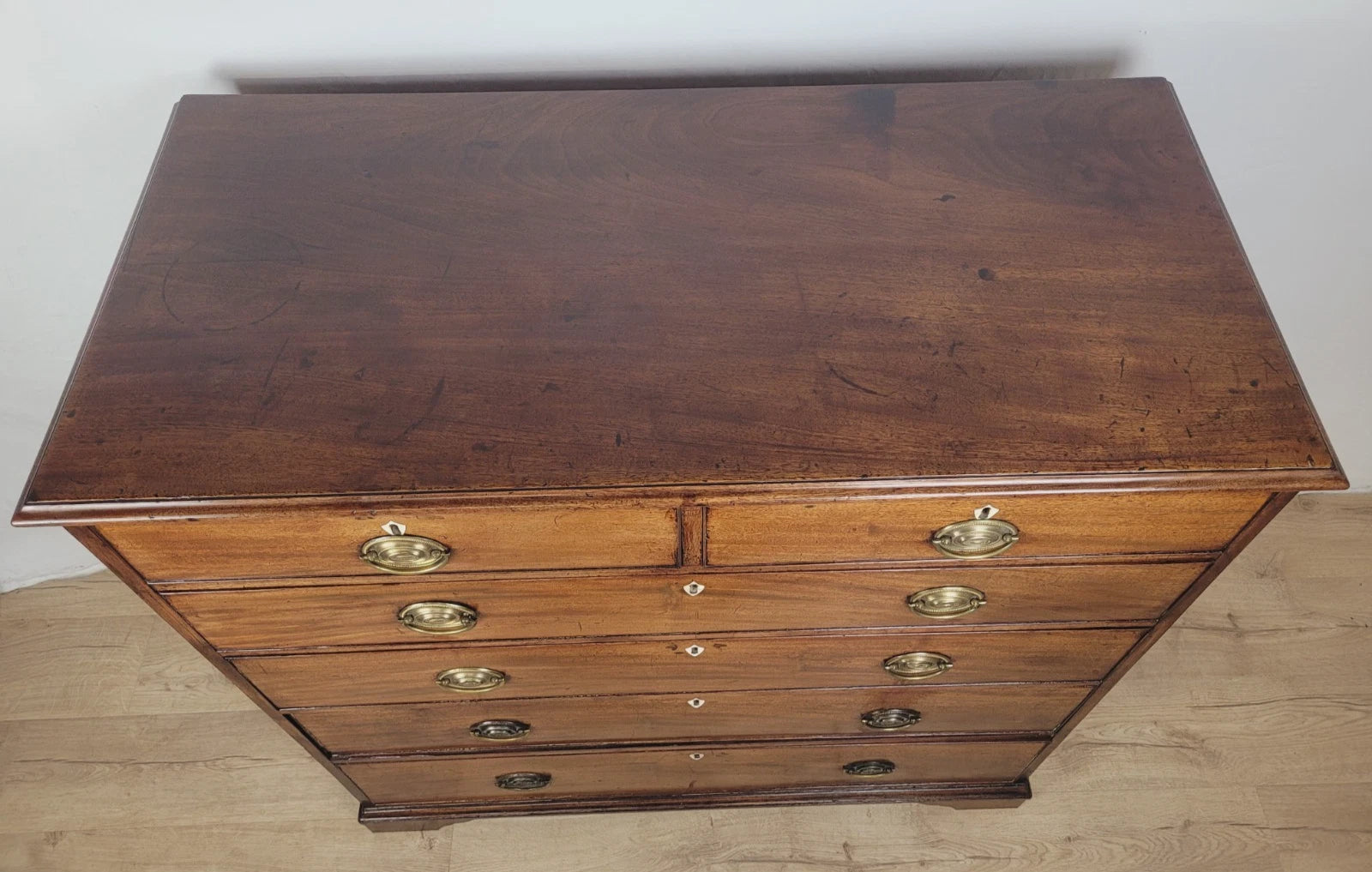 The chest front has an excellent arrangement of two short over four large graduating drawers. Each drawer has striking matching oval brass drop handles, with a raised boarder to finish. The drawers have gorgeous shield shaped key holes to the drawers, unfortunately there is no key, but this does not effect the functionality of the item at all.