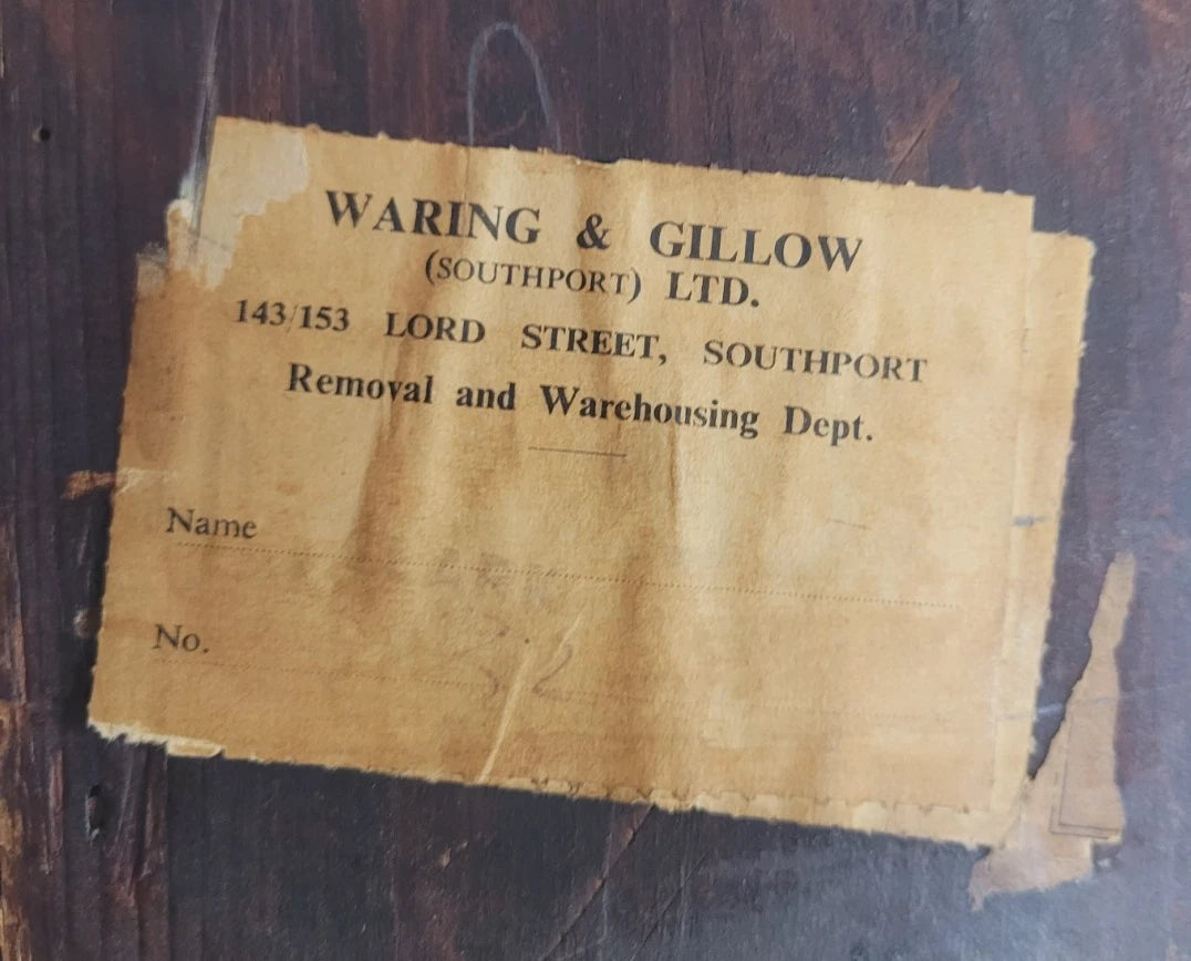 Displaying the original paper sign to the backside of the chest reading 'Waring & Gillow (Southport) LTD' to identify the item as authentic.